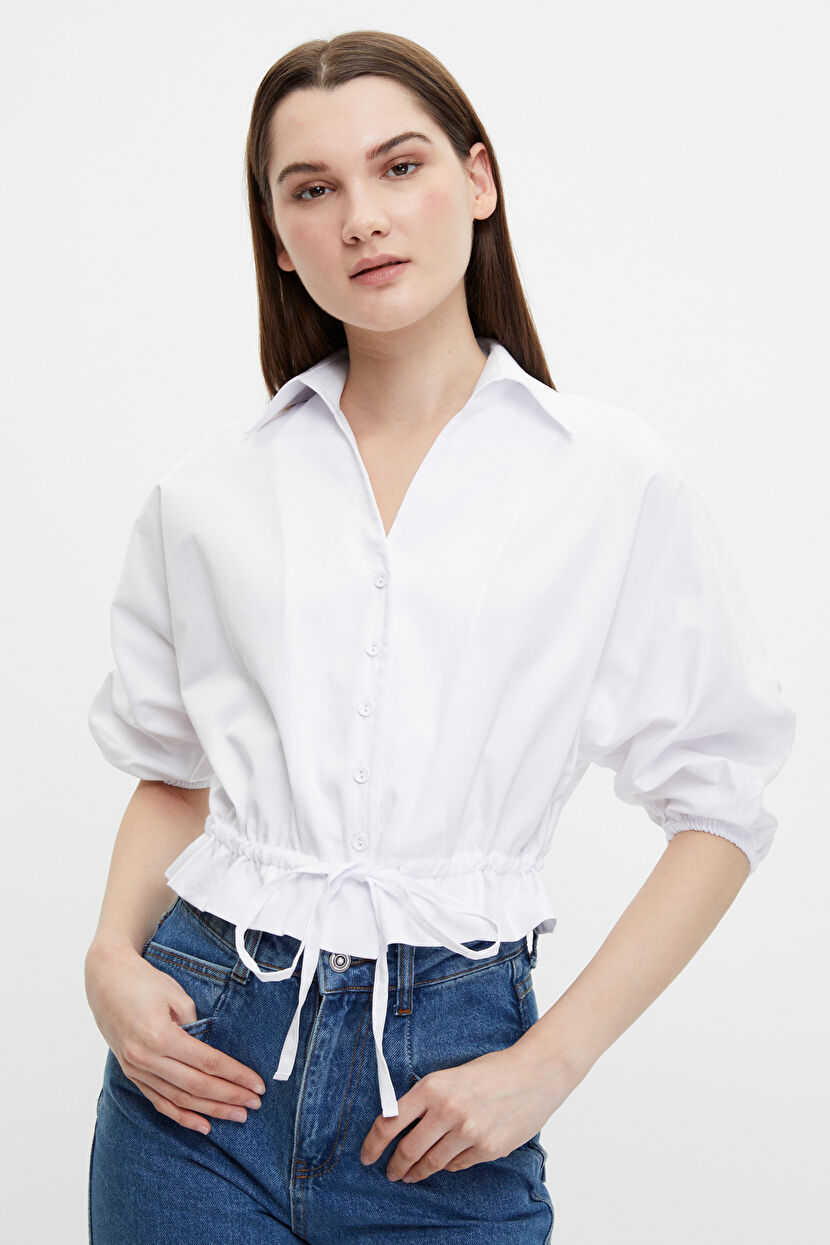 Beyaz Beli Ayarlanabilir Bağlamalı Gömlek