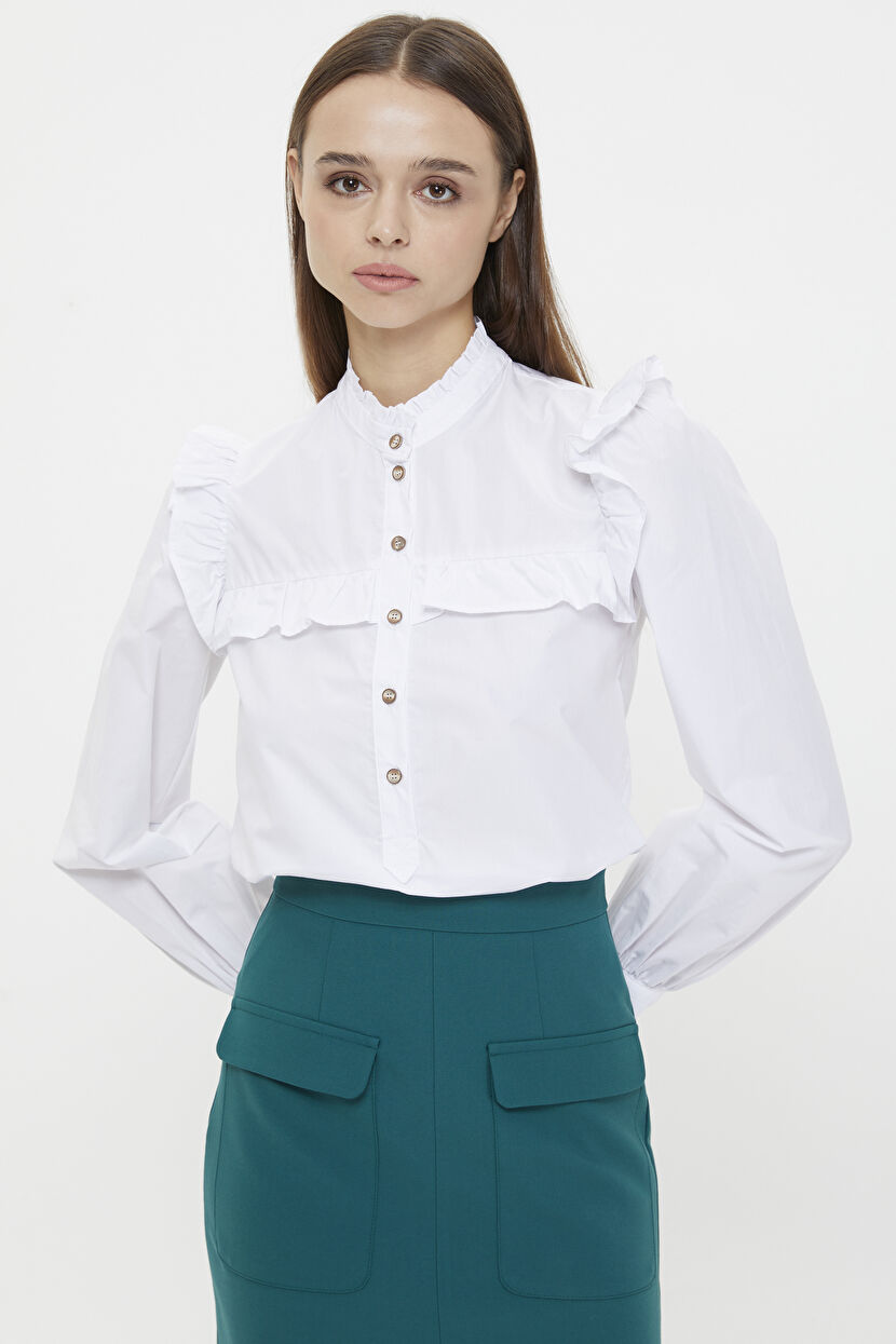 Beyaz Hakim Yaka Volanlı Uzun Kol Gömlek