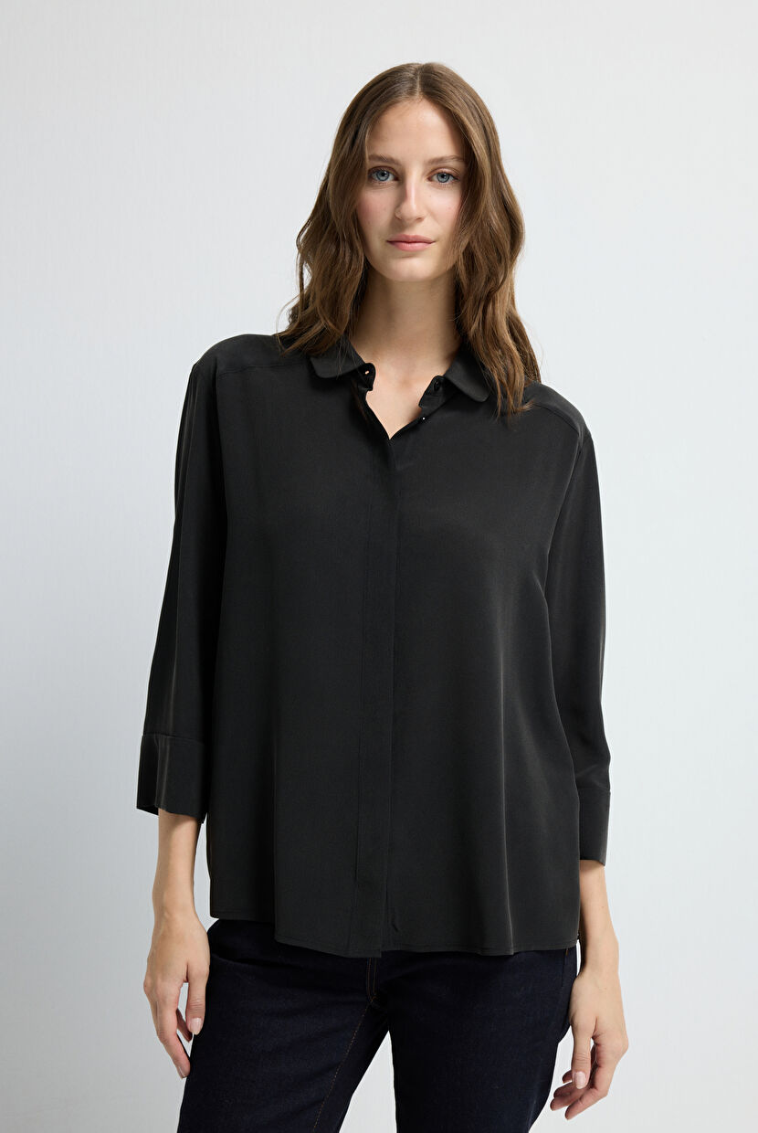 Siyah Bebe Yaka İpek Gömlek