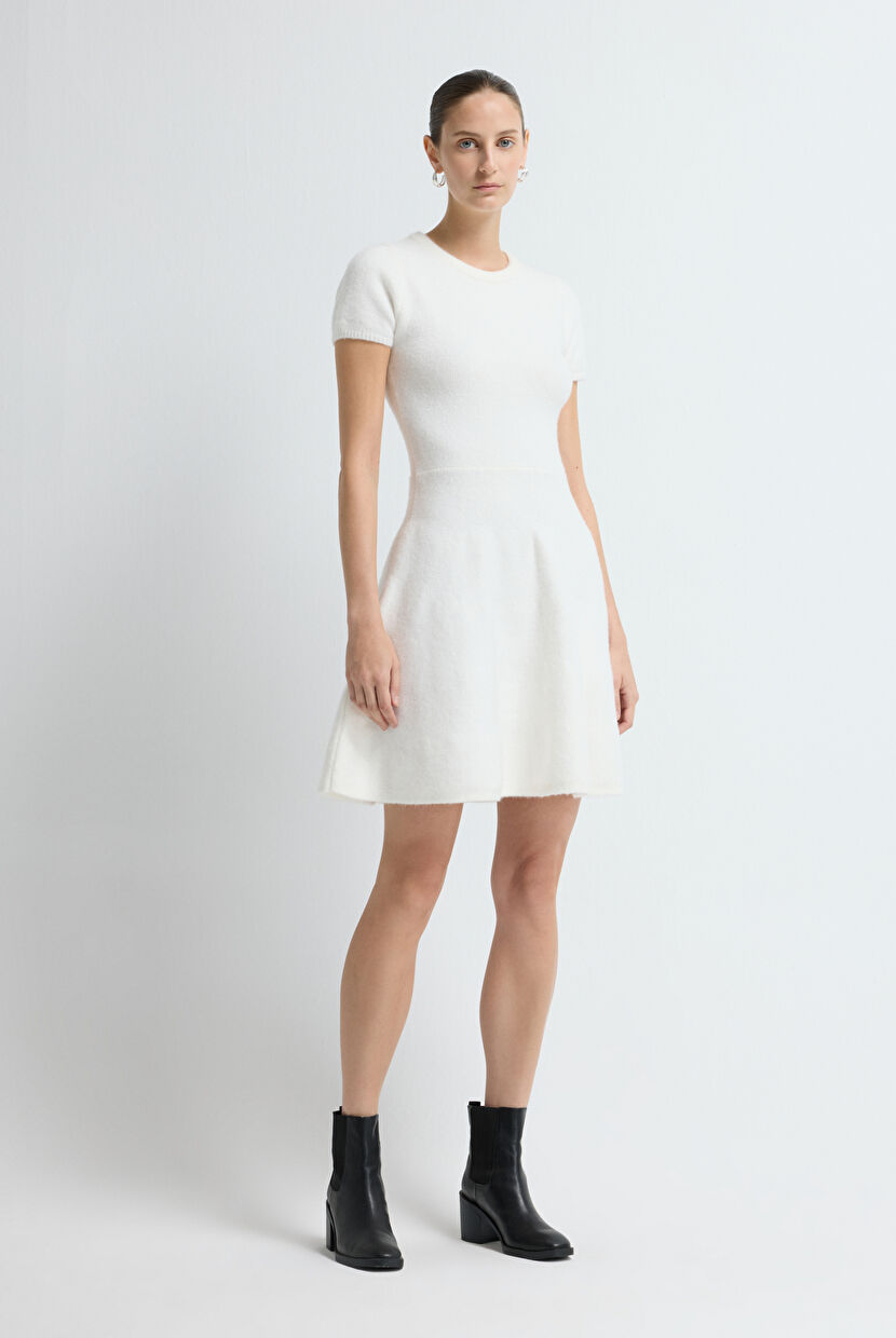 Ekru Volanlı Kısa Triko Elbise