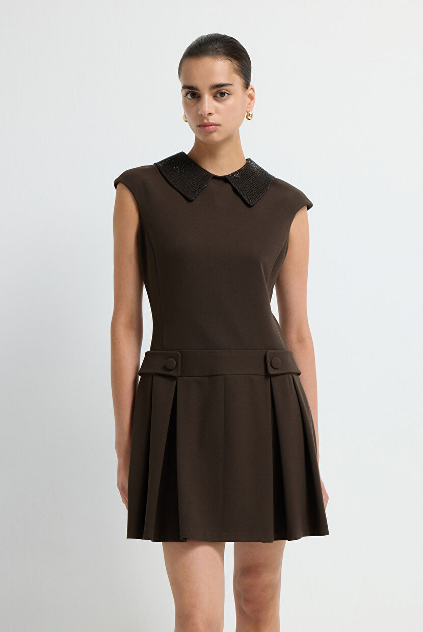 Kahverengi Yakası Taş Detaylı Gabardin Elbise