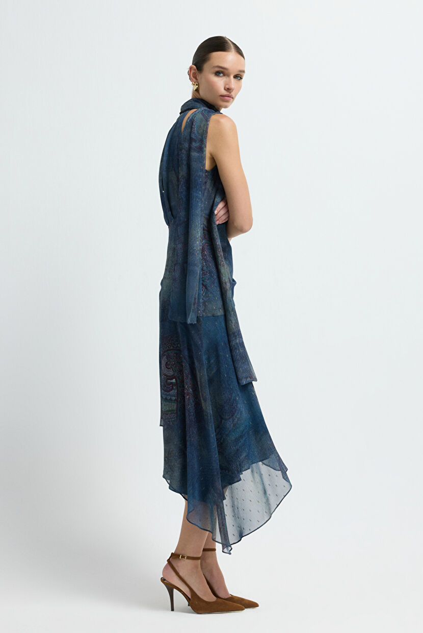 Lacivert Desenli Şifon Elbise