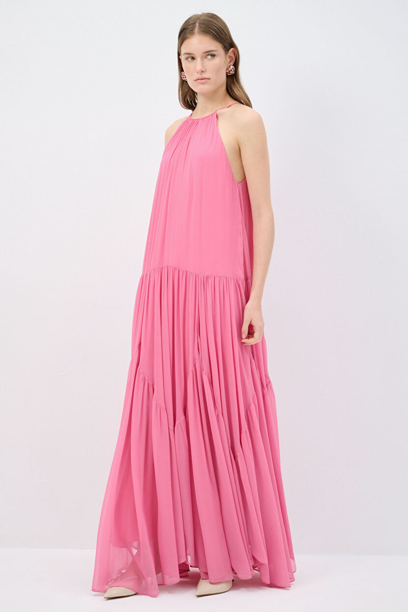 Pembe Büzgü Detaylı Kolsuz Uzun Elbise