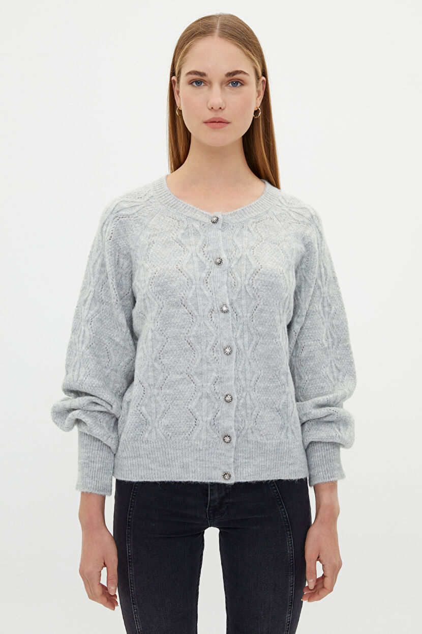Gri Kristal Taşlı Düğmeli Triko Hırka