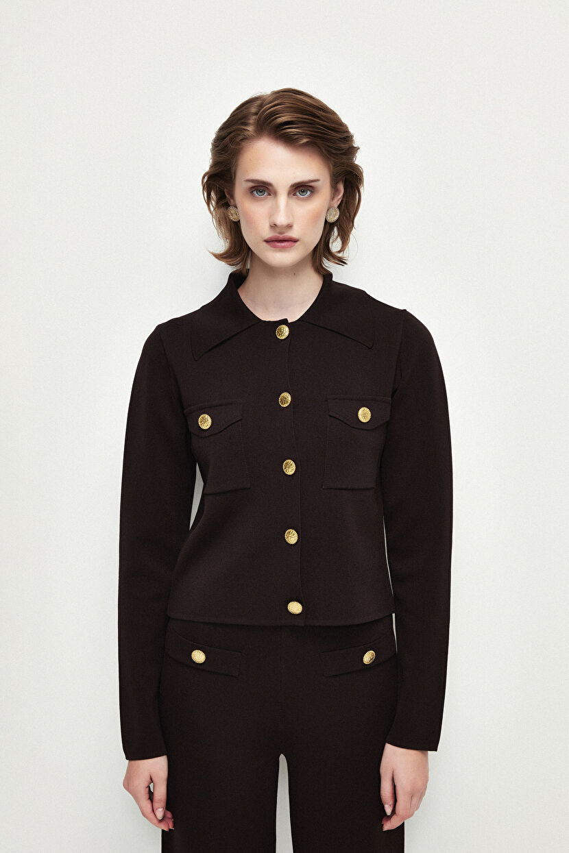 Kahverengi Metal Düğmeli Triko Hırka