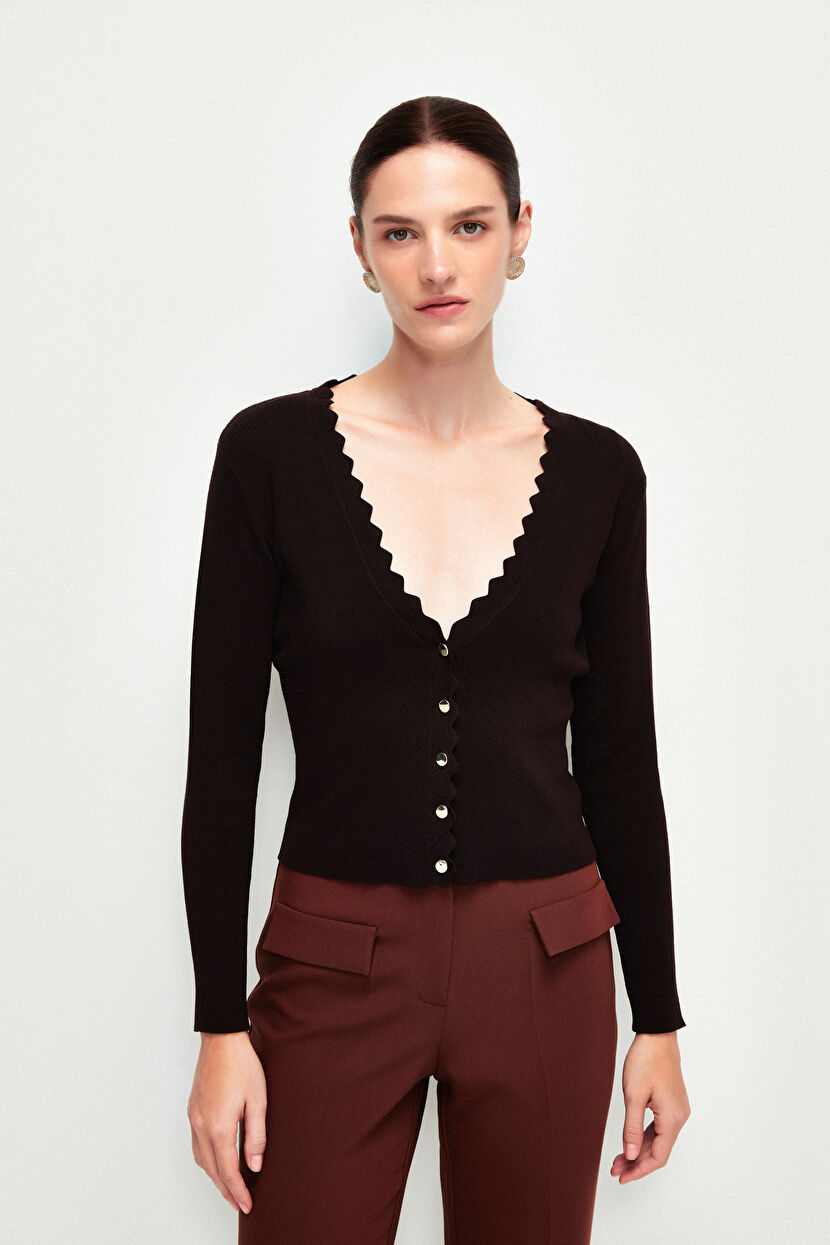 Kahverengi Önü Düğmeli Zigzag Triko Hırka
