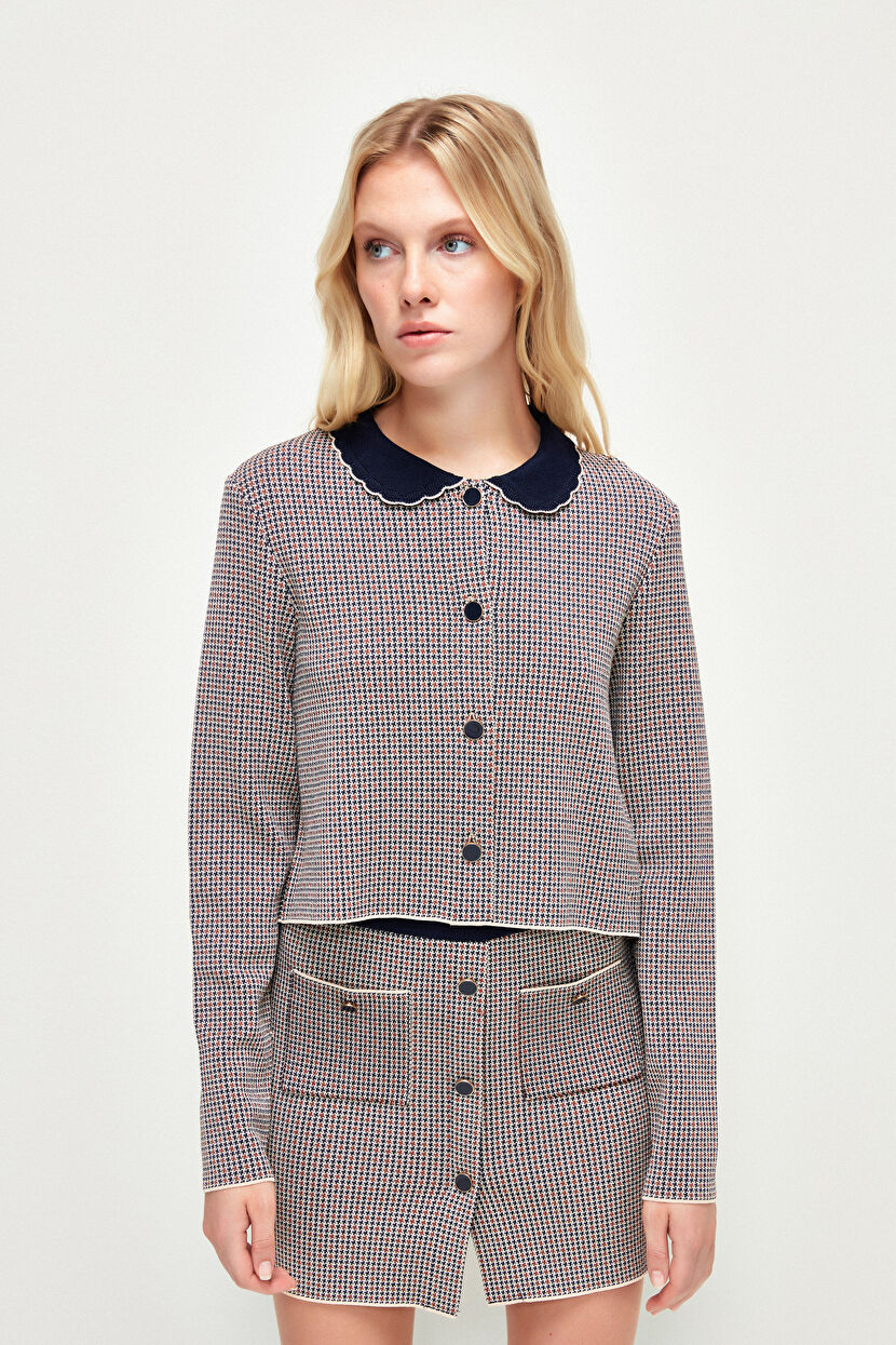 Lacivert Önü Düğmeli Desenli Triko Hırka