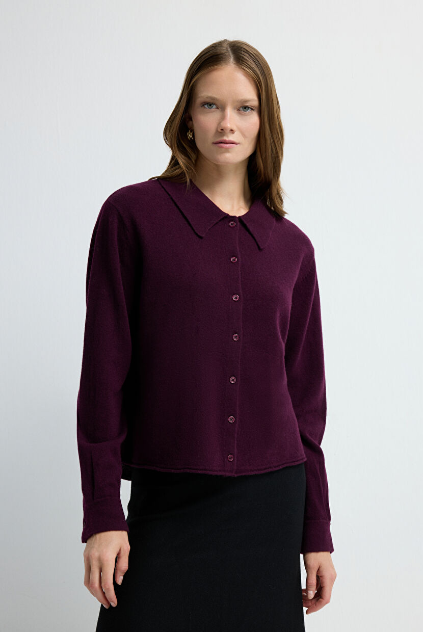 Mürdüm Düğme Detaylı Yün Triko Hırka