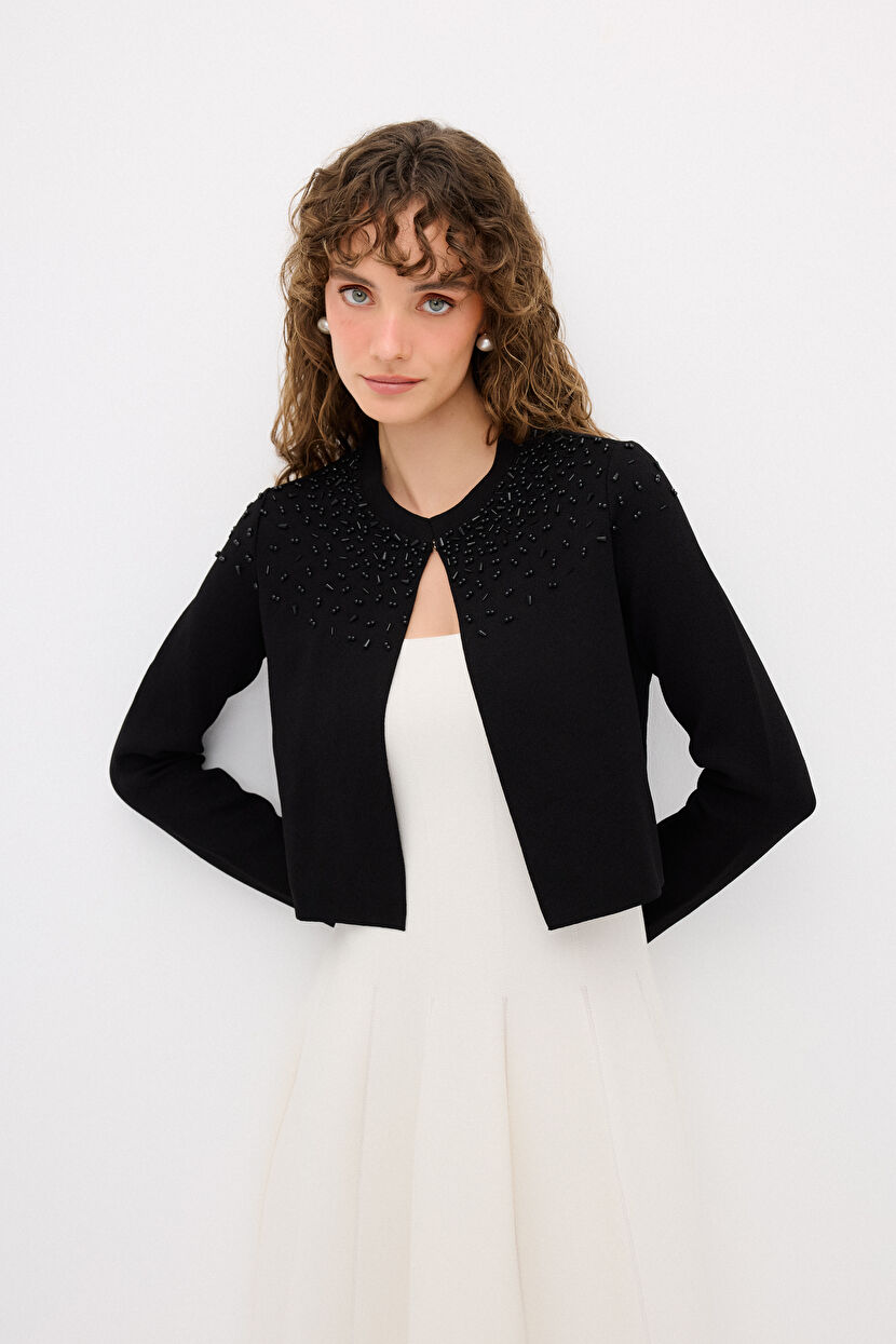 Siyah İşlemeli Triko Hırka