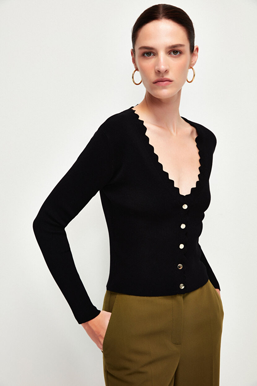 Siyah Önü Düğmeli Zigzag Triko Hırka