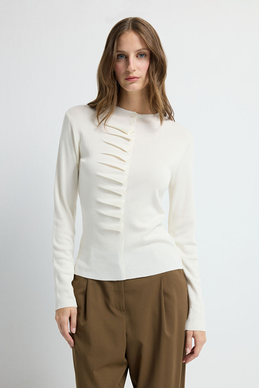 Kahverengi Dik Yaka Balıkçı Kolsuz Asetat Triko Bluz