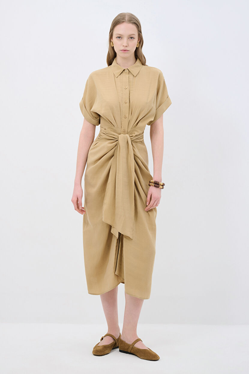 Kahverengi Kuşaklı Uzun Elbise