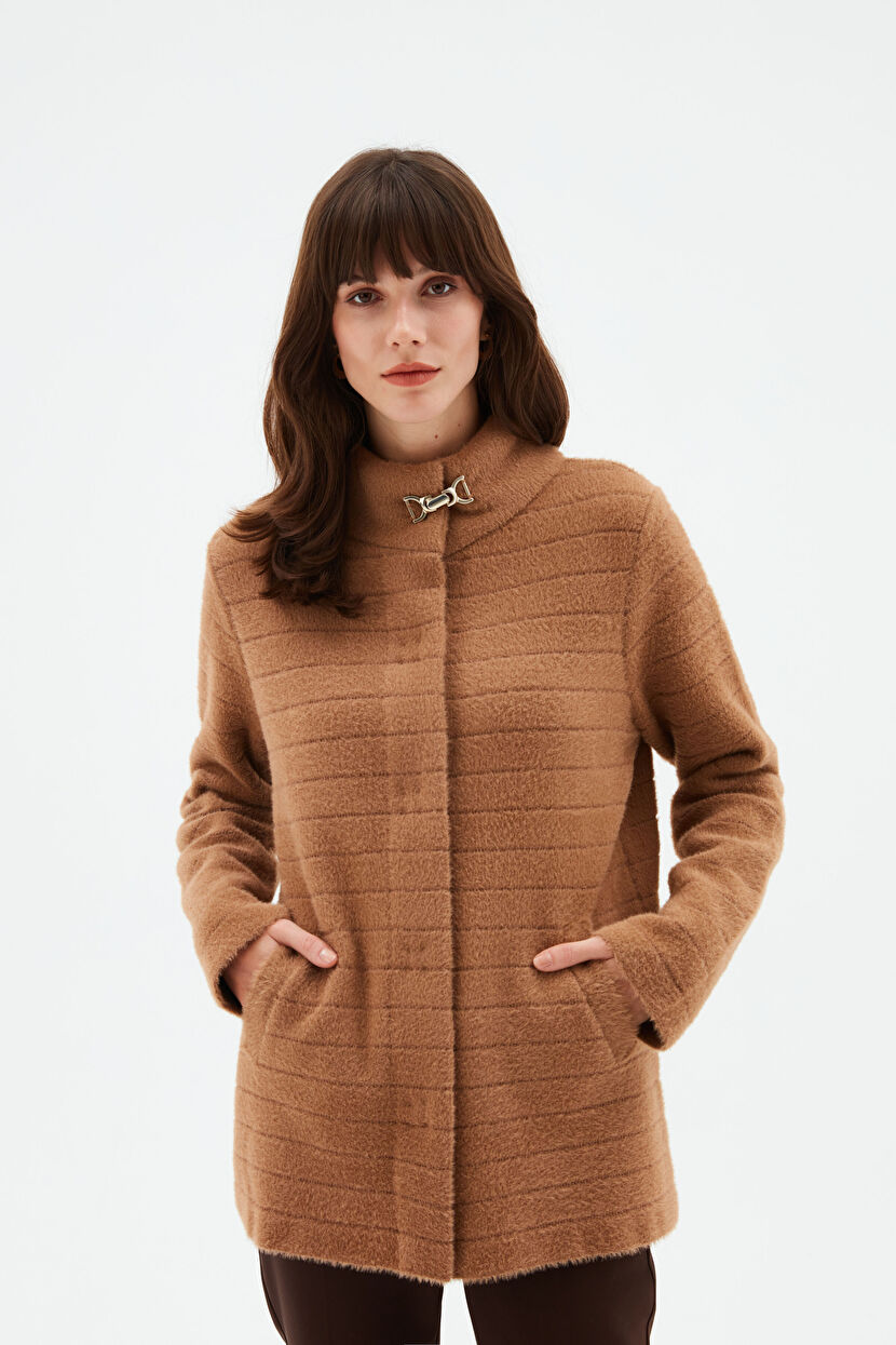 Camel Dik Yaka Kısa Triko Kaban