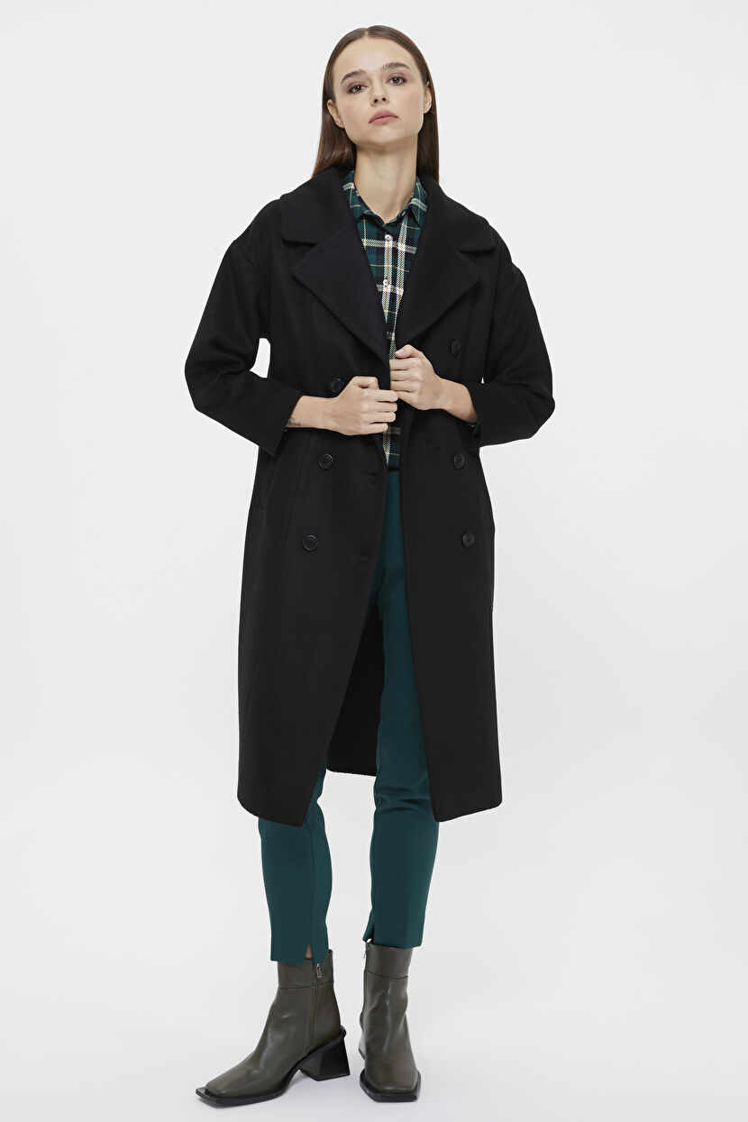 Siyah Koza Form Kruvaze Kaşe Kaban