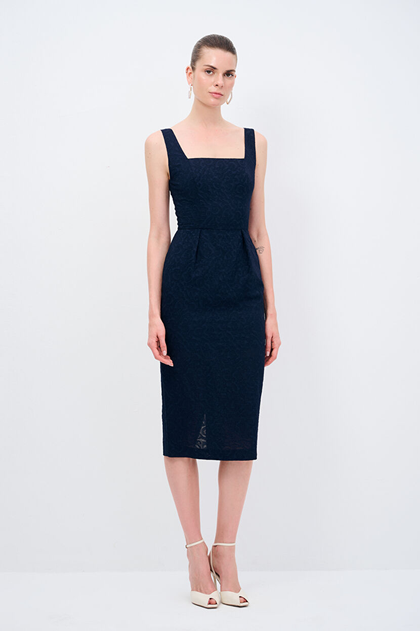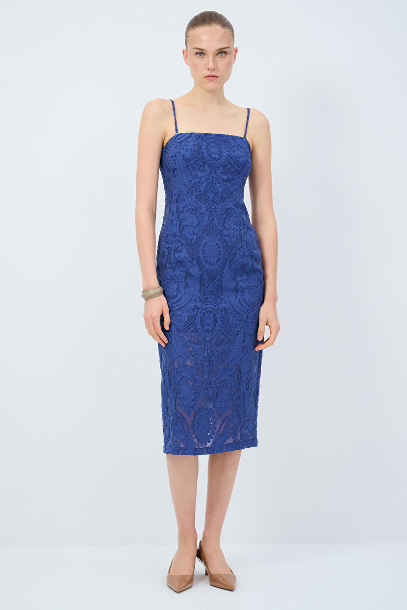 Lacivert Askılı Jakar Elbise