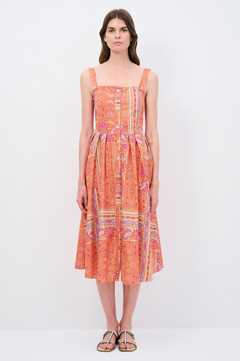 Turuncu Askılı Desenli Elbise