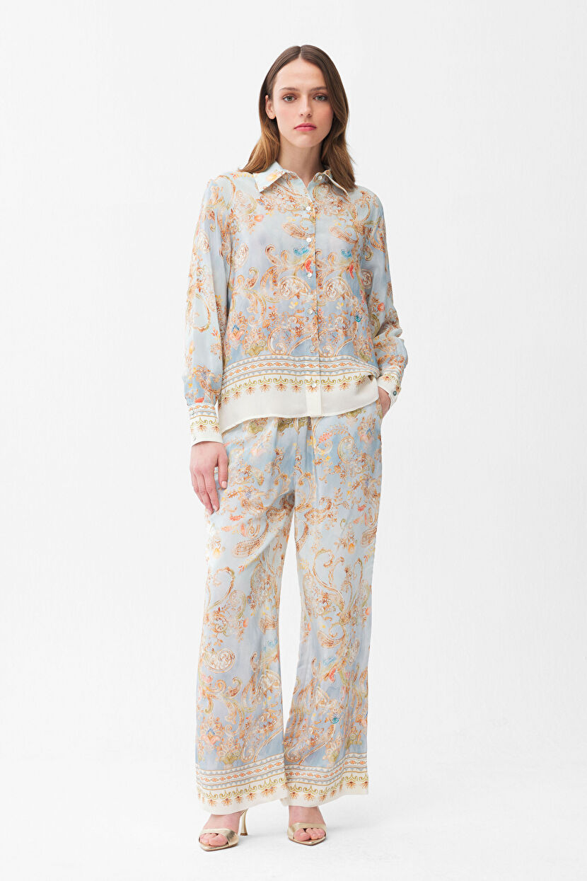 Mavi Beli Lastikli Cep Detaylı Desenli Pantolon