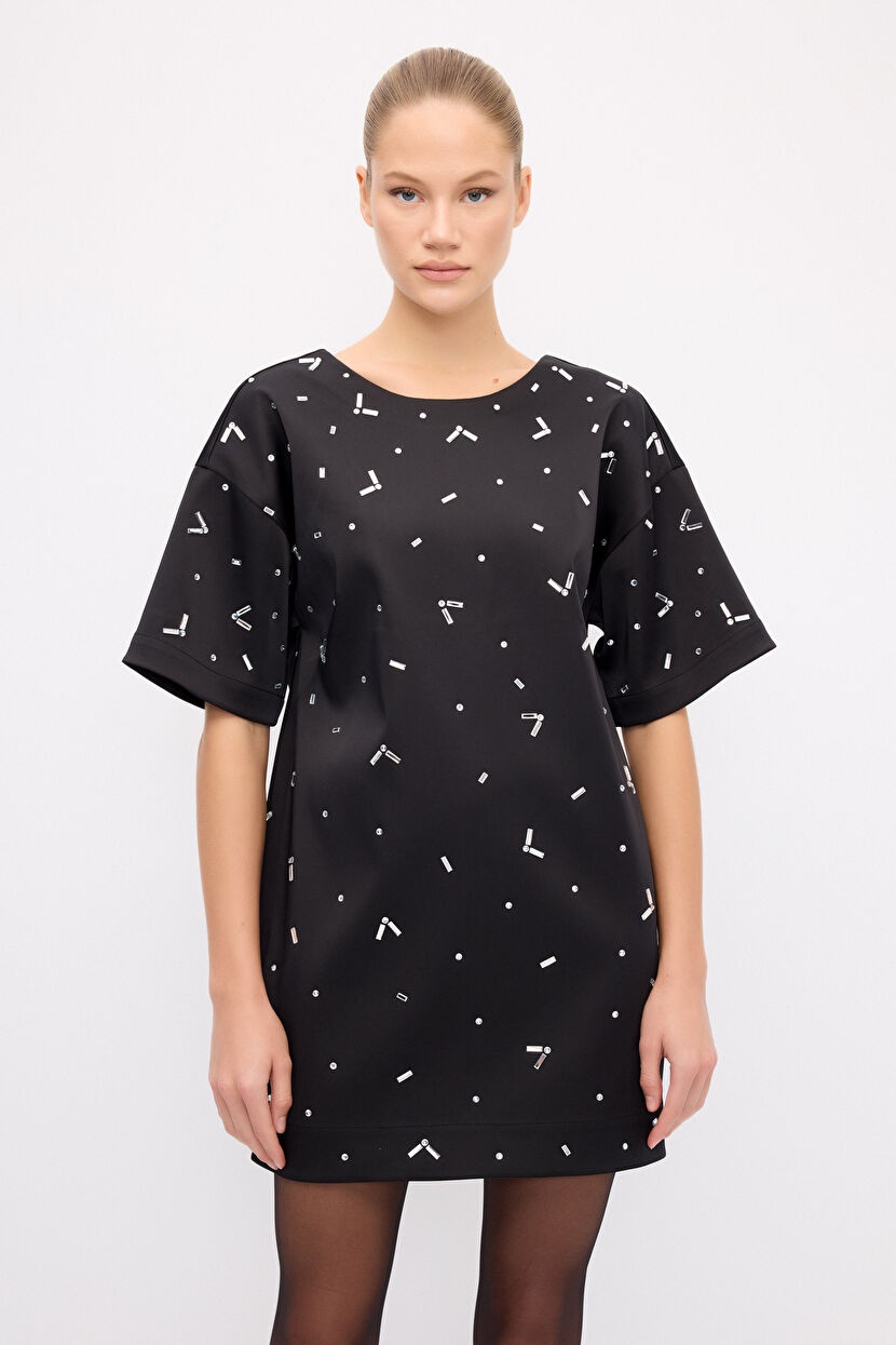 Siyah Night Zoom Taş Detaylı Mini Elbise