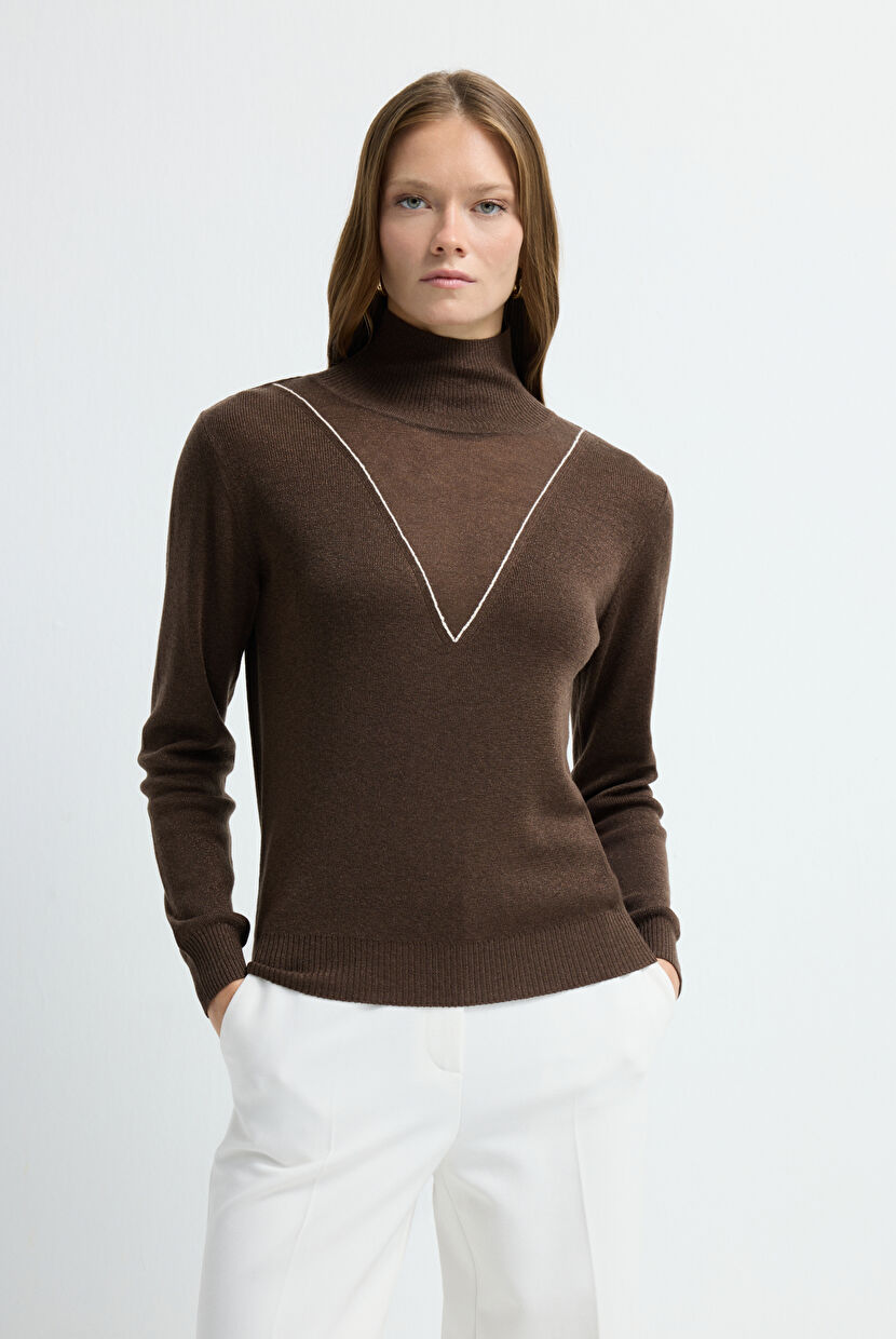 Kahverengi Simli Balıkçı Yaka Yün Karışımlı Triko Kazak