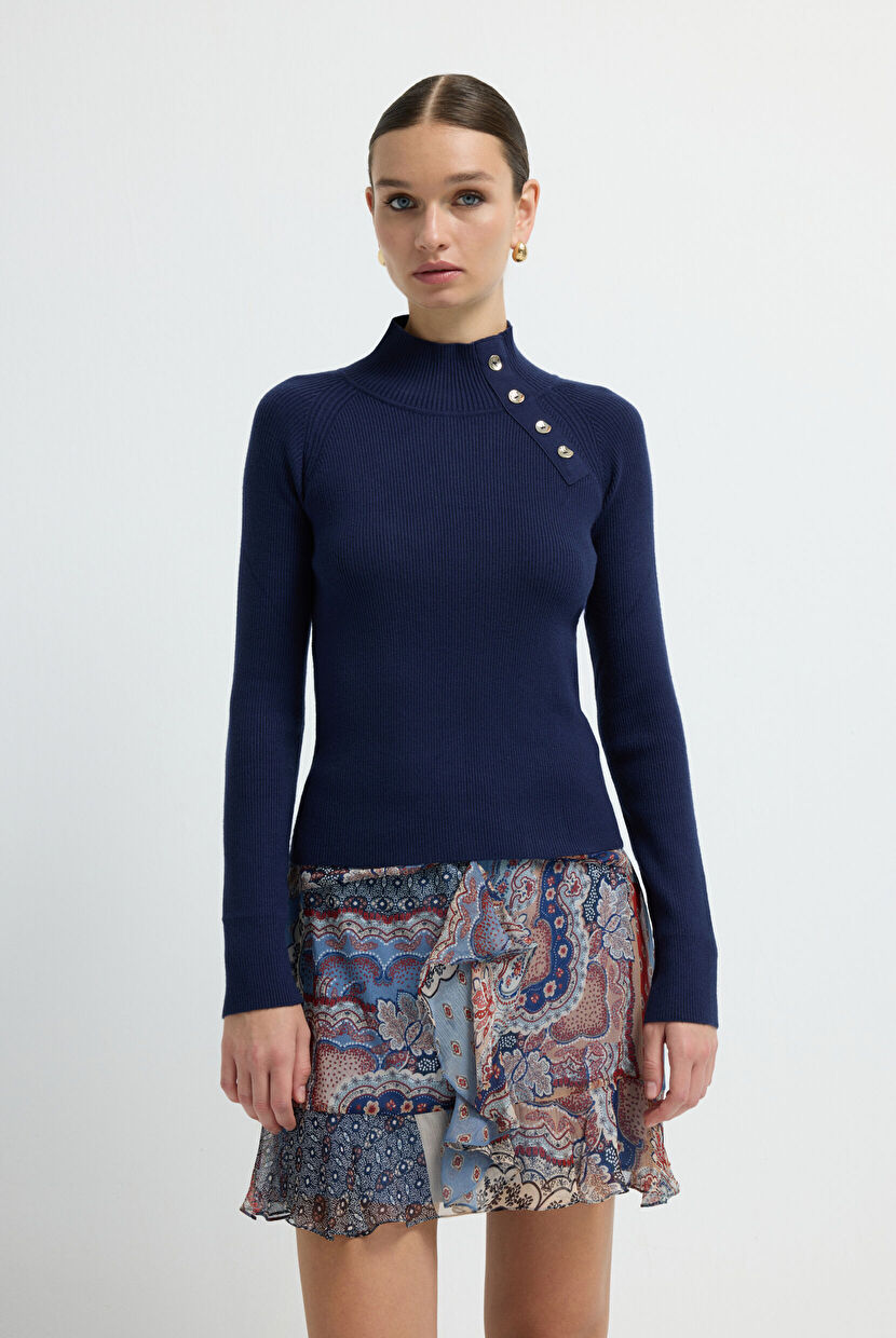 Lacivert Düğme Detaylı Boğazlı Kazak