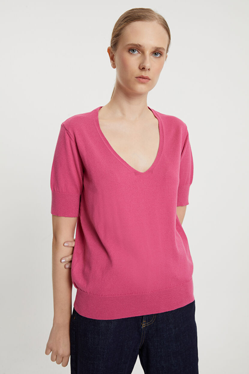 Pembe V Yaka Triko Kazak