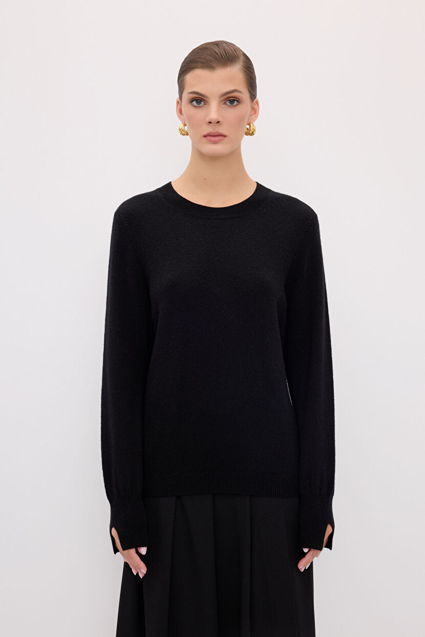 Siyah Bisiklet Yaka Kaşmir Karışımlı Triko Kazak