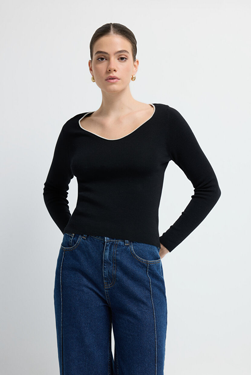 Siyah Biye Detaylı Triko Kazak