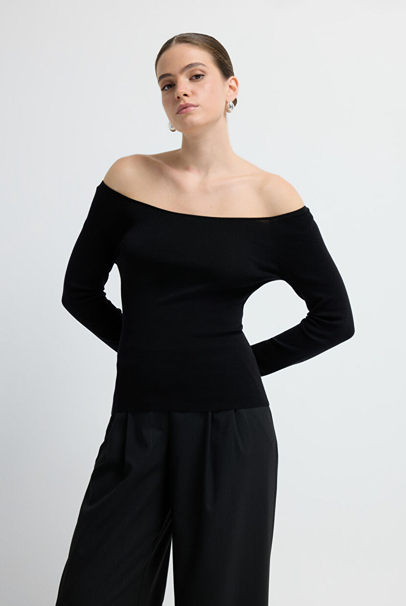 Siyah Kayık Yaka Asetat Karışımlı Triko Kazak