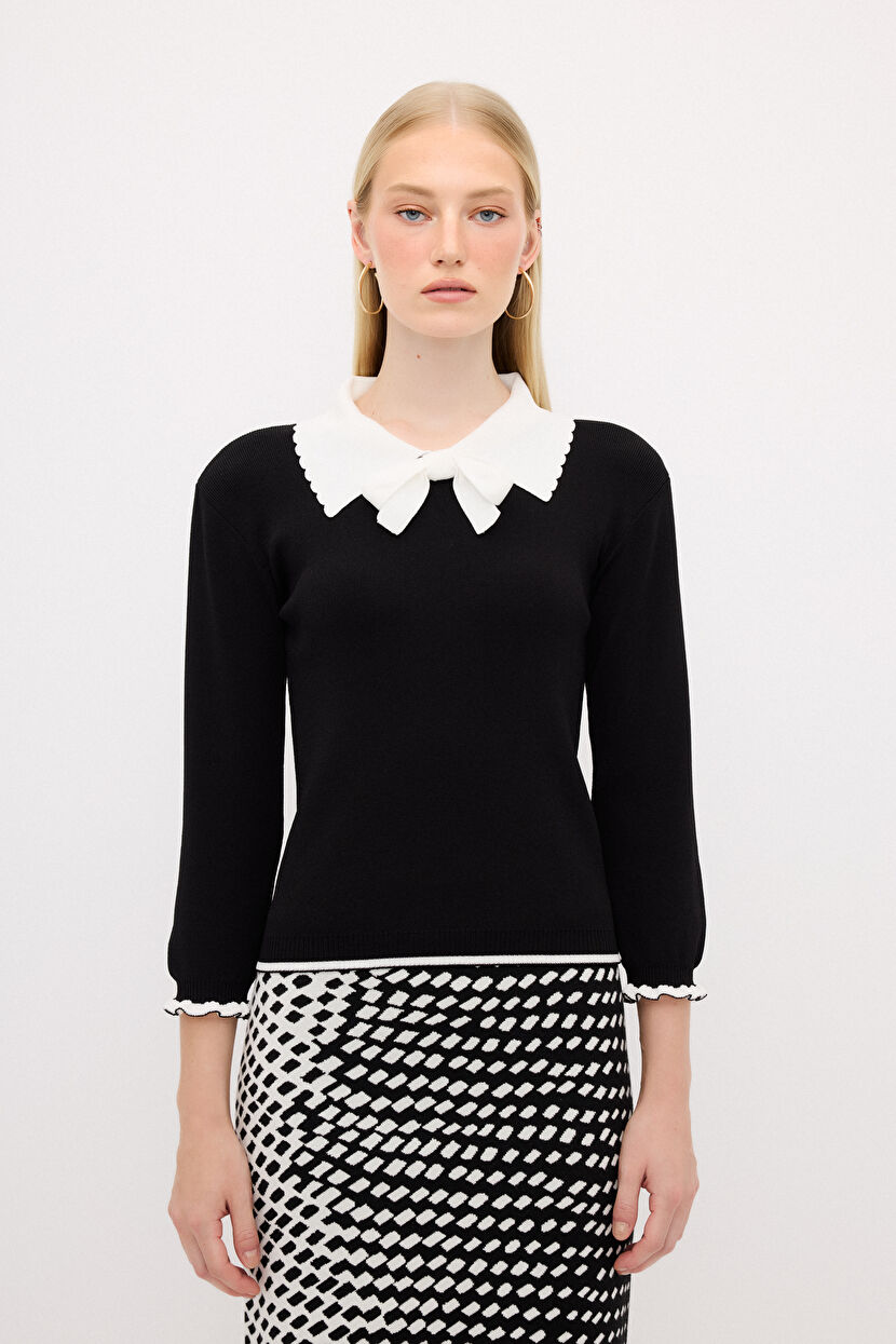 Siyah Yakası Fiyonk Detaylı Triko Kazak