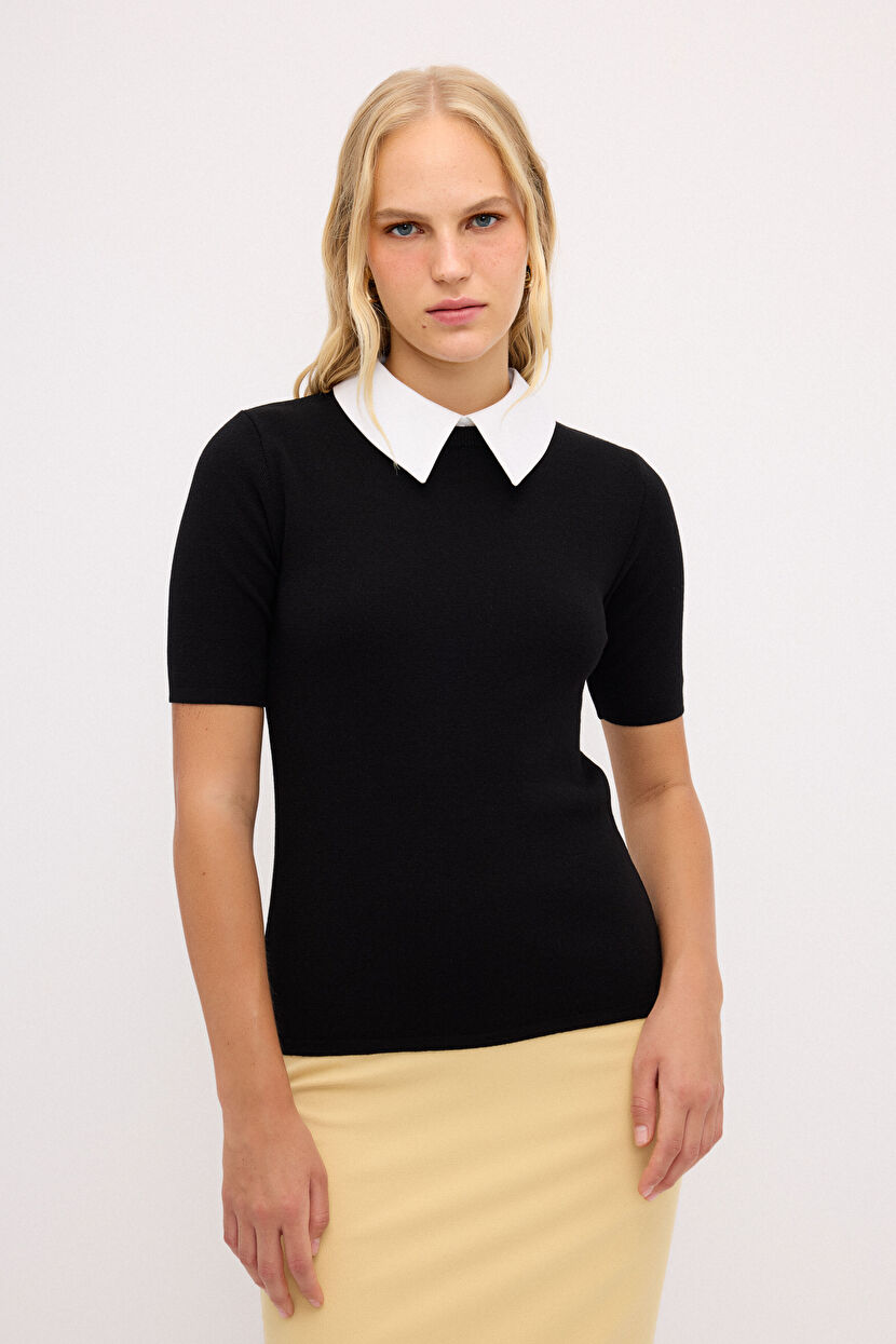 Siyah Yakası Poplin Kısa Kollu Triko Kazak