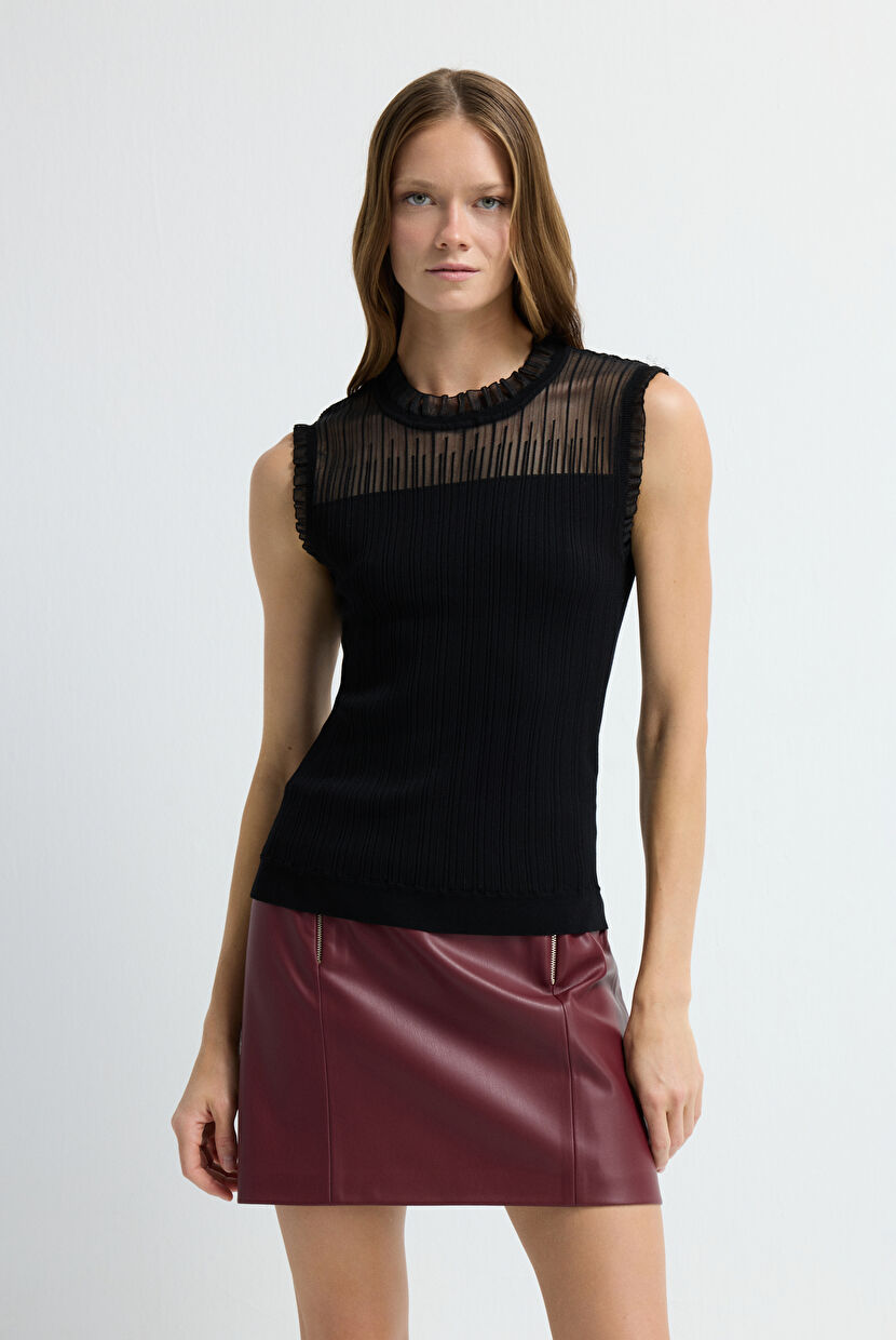 Siyah Tül Detaylı Kolsuz Triko Bluz