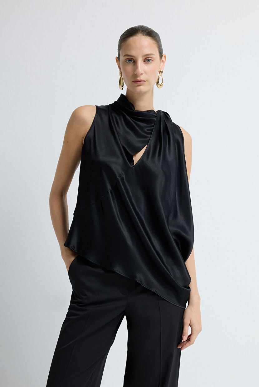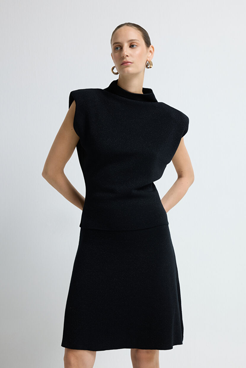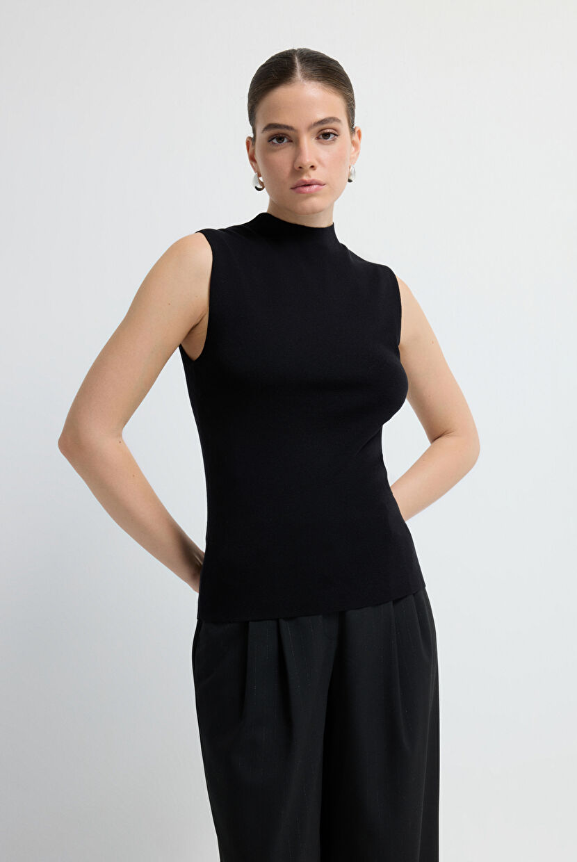 Siyah Dik Yaka Balıkçı Kolsuz Asetat Triko Bluz