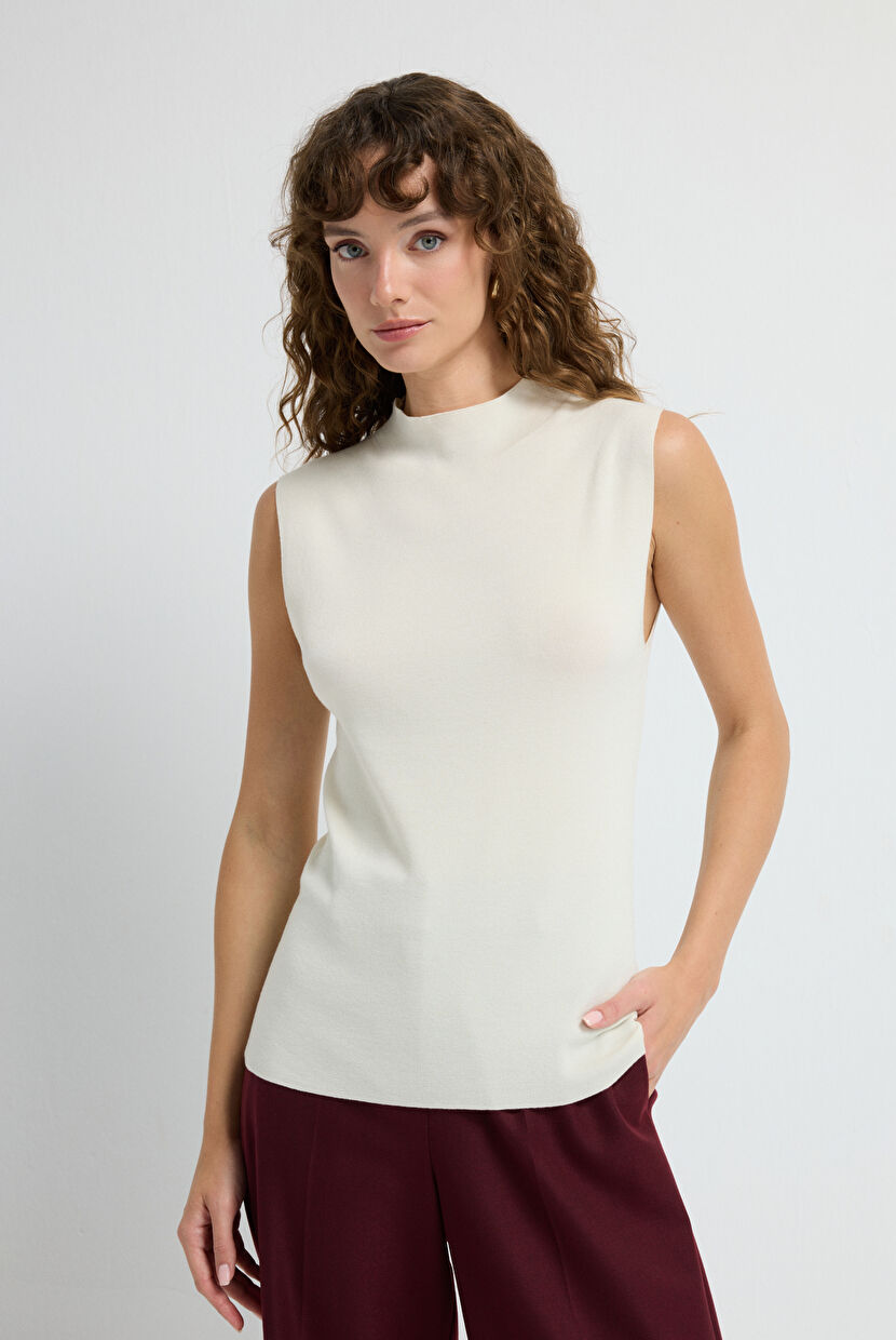 Vanilya Dik Yaka Balıkçı Kolsuz Asetat Triko Bluz
