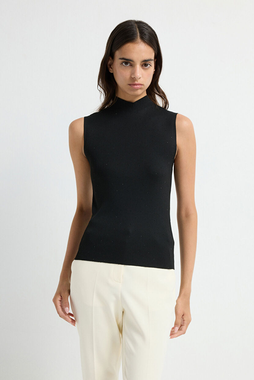 Siyah Taşlı Boğazlı Kolsuz Triko Bluz