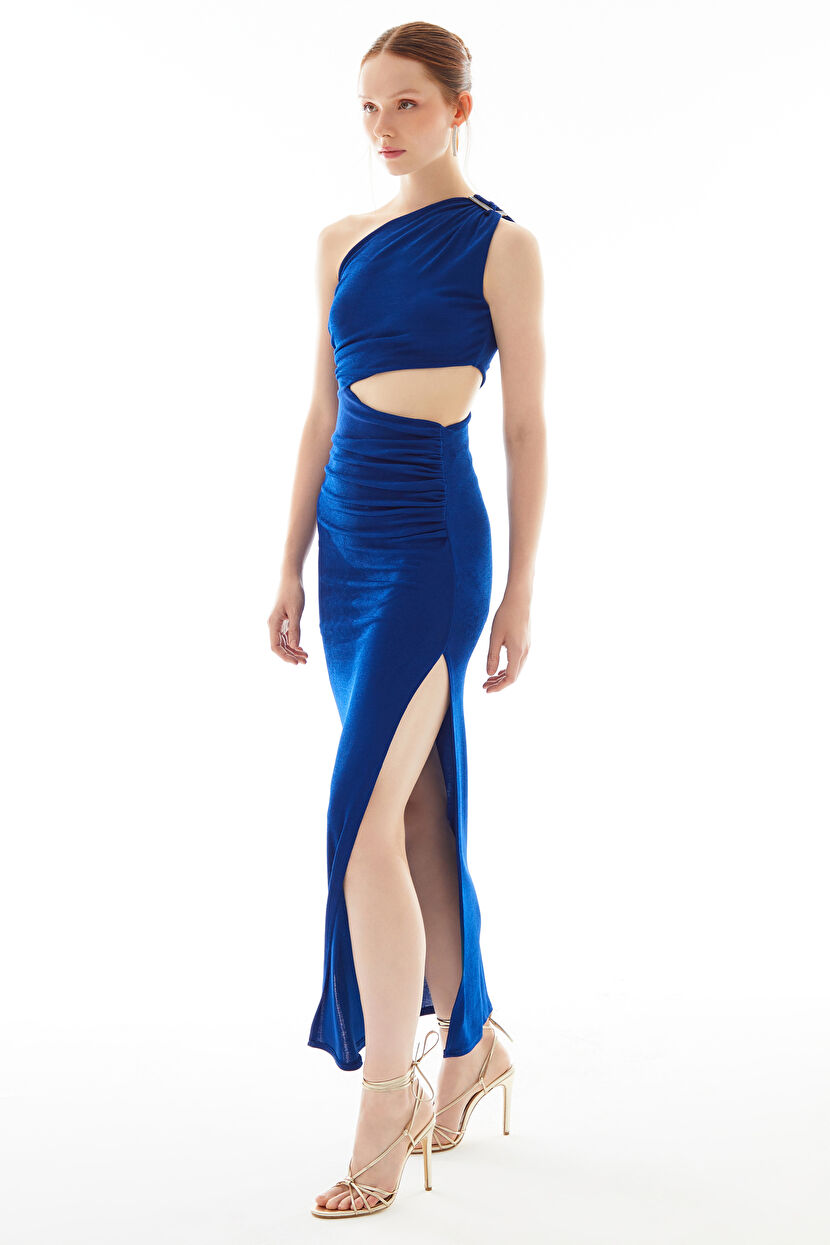 Lacivert Tek Omuz Büzgülü Örme Elbise
