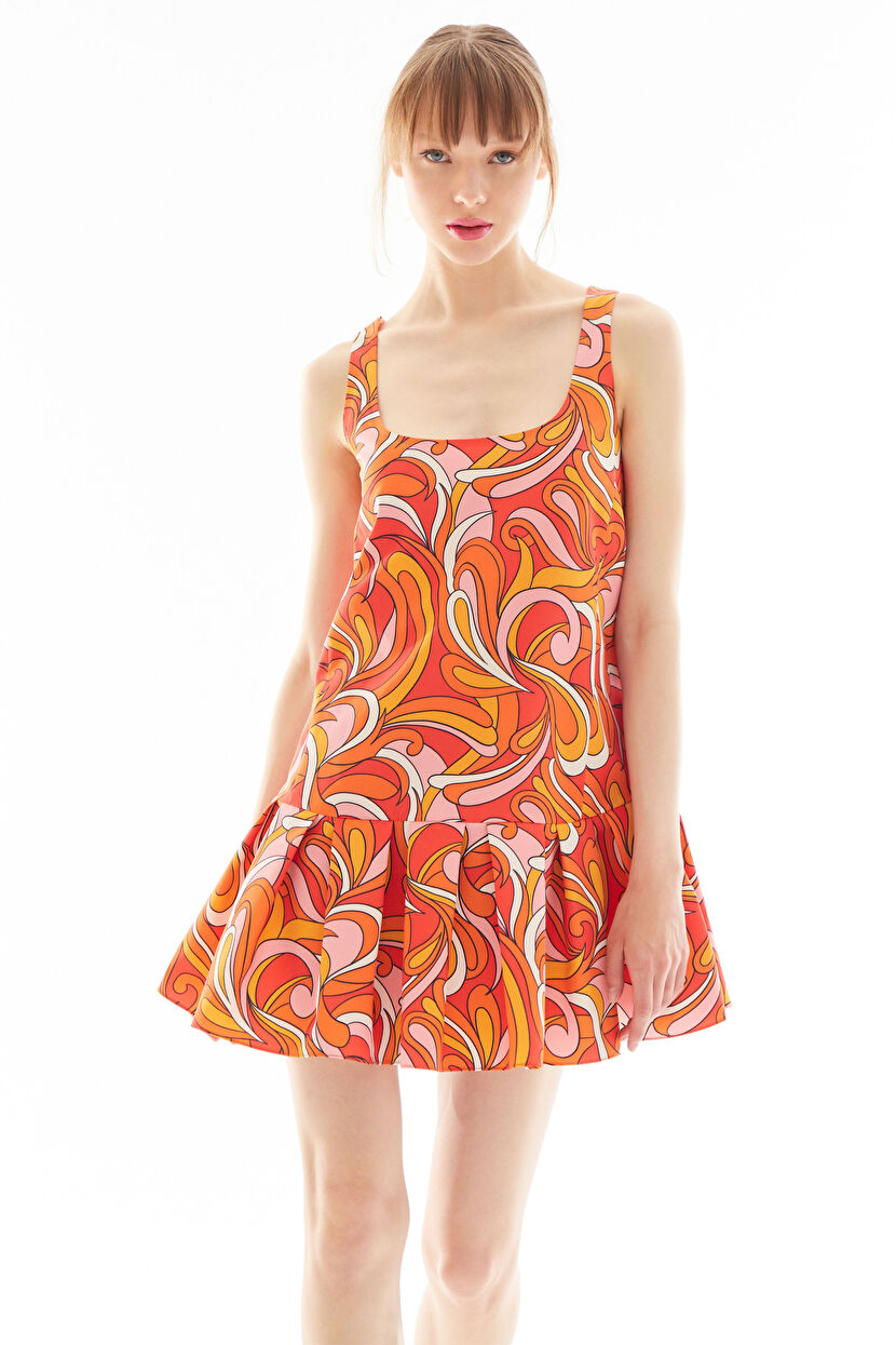 Turuncu Eteği Volanlı Desenli Tafta Elbise