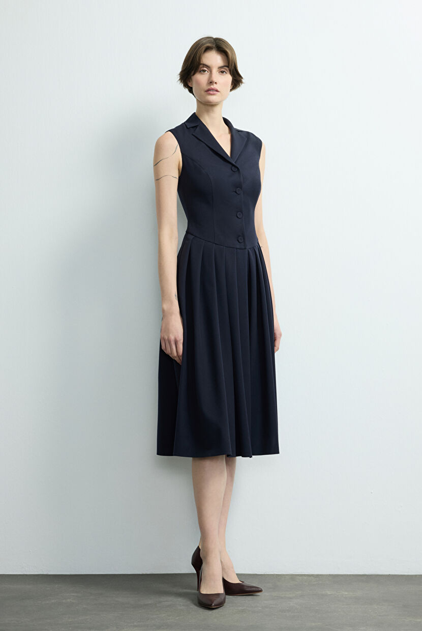 Lacivert Pileli Kolsuz Elbise