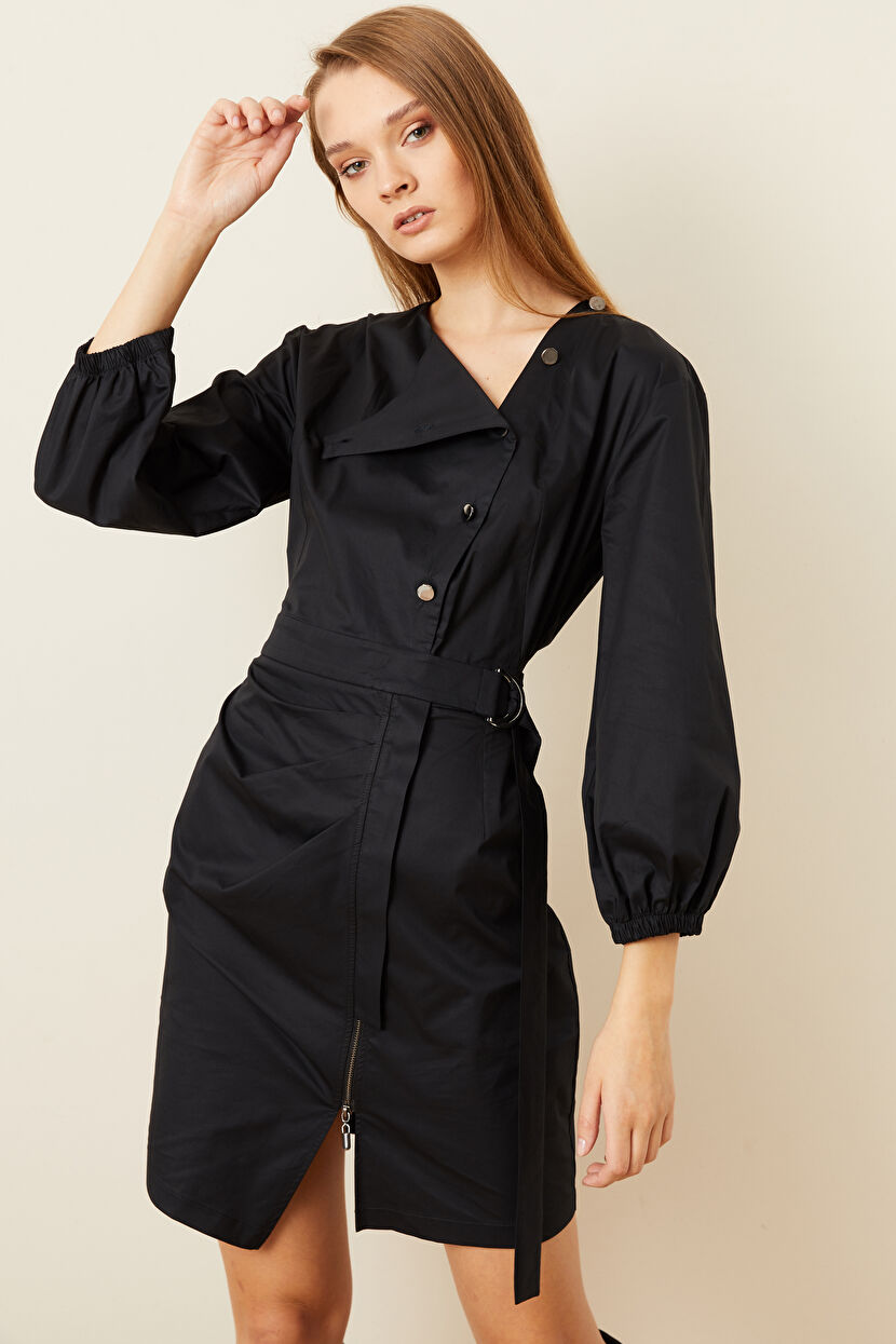 Siyah Fermuar Detaylı Düğmeli Elbise
