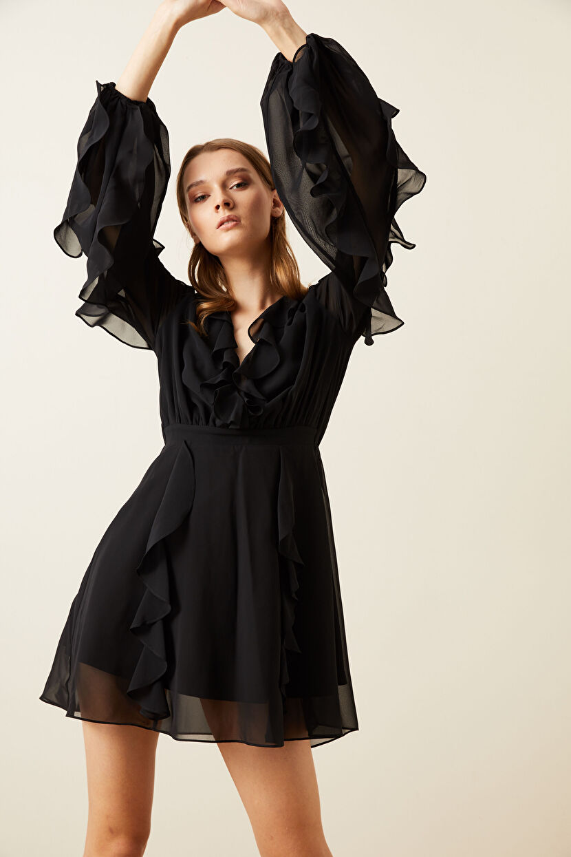 Siyah Kruvaze Volanlı Şifon Elbise