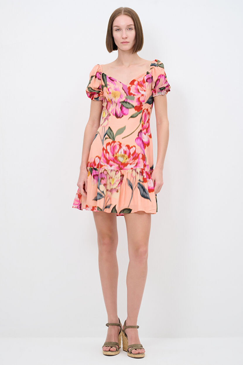 Turuncu Kalp Yaka Balon Kol Desenli Mini Elbise