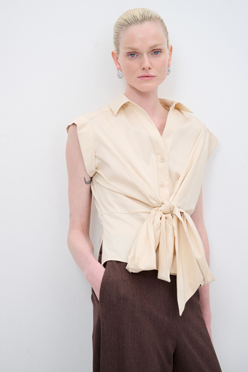Beyaz Beli İp Detaylı Kısa Kollu Keten Gömlek