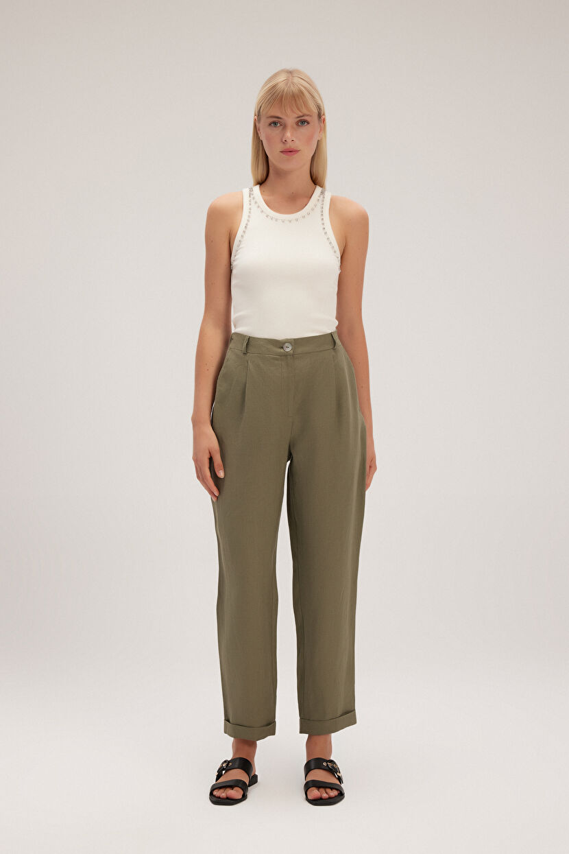 Haki Duble Paça Keten Pantolon
