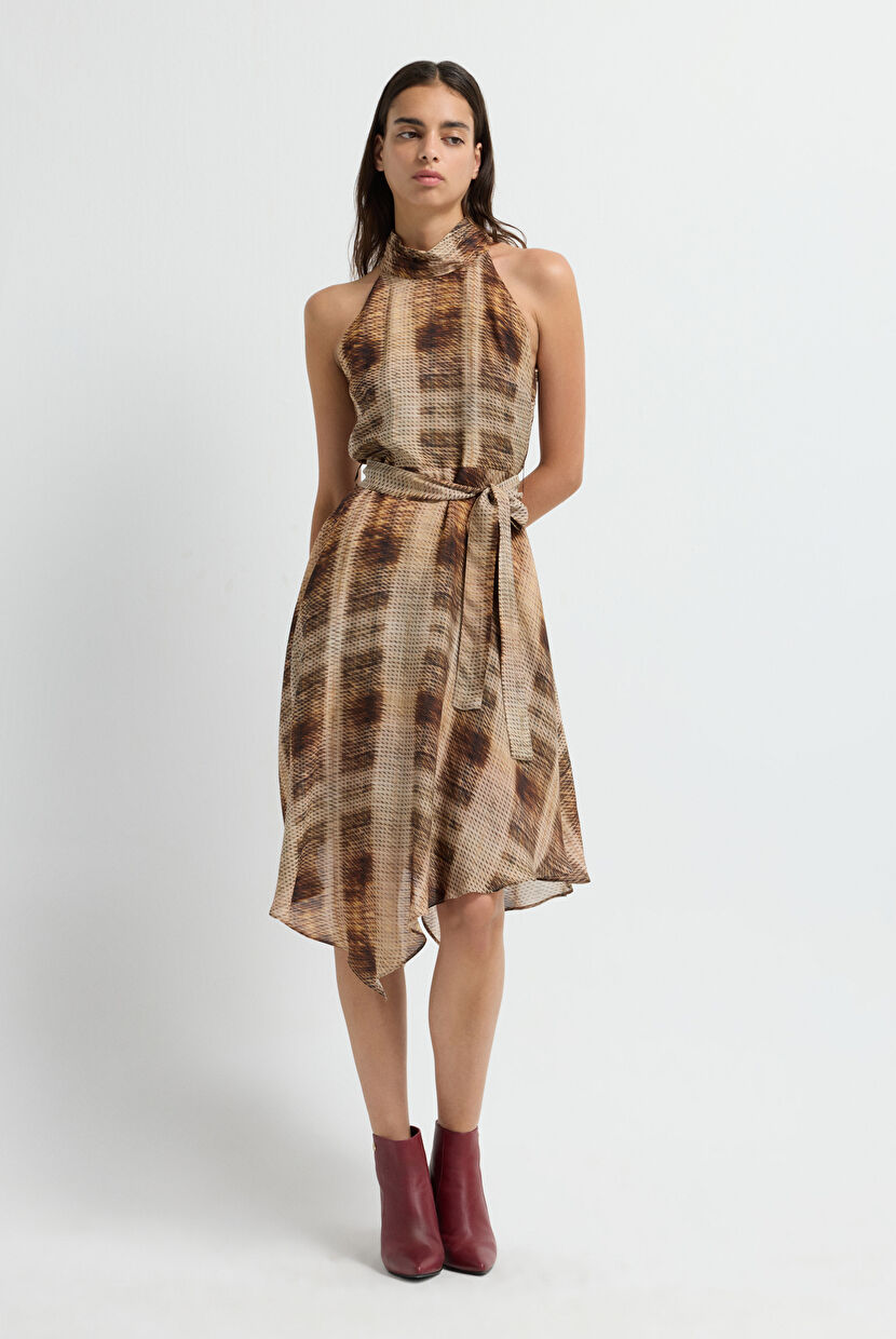 Kahverengi Kolsuz Asimetrik Desenli Elbise