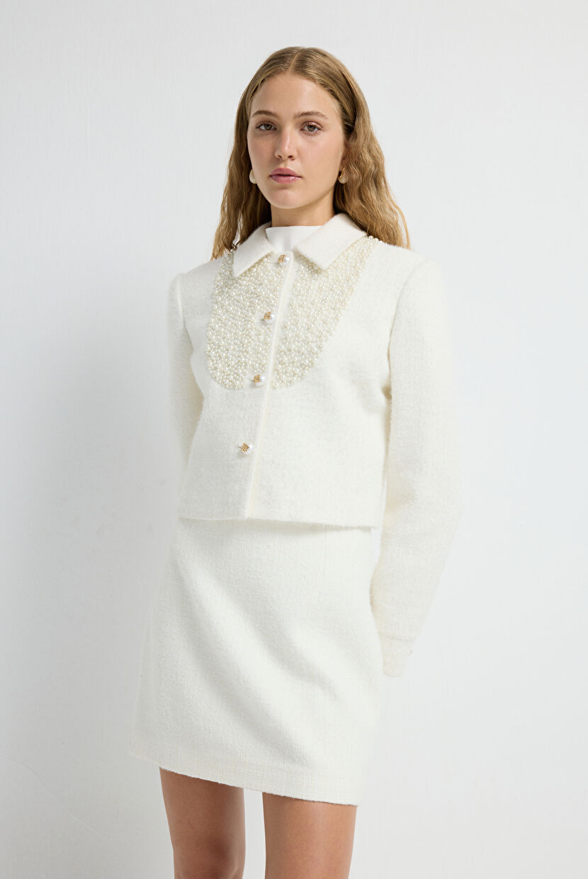 Lacivert Denim Görünümlü Çizgili Kısa Ceket