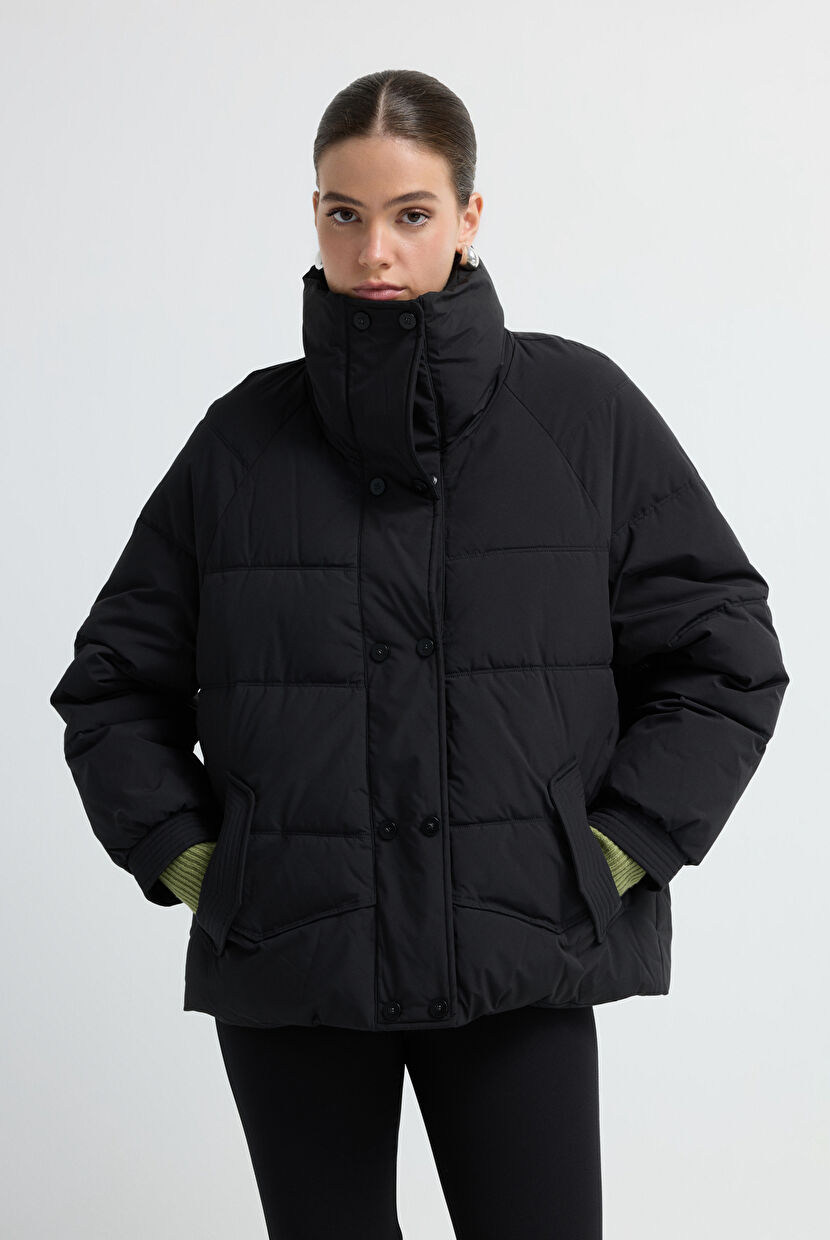 Siyah Kürk Detaylı Uzun Şişme Mont