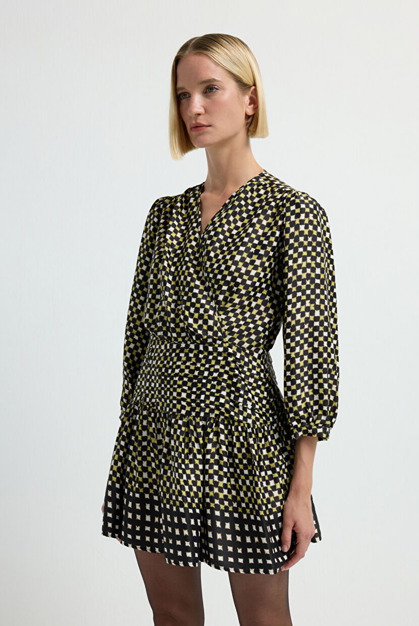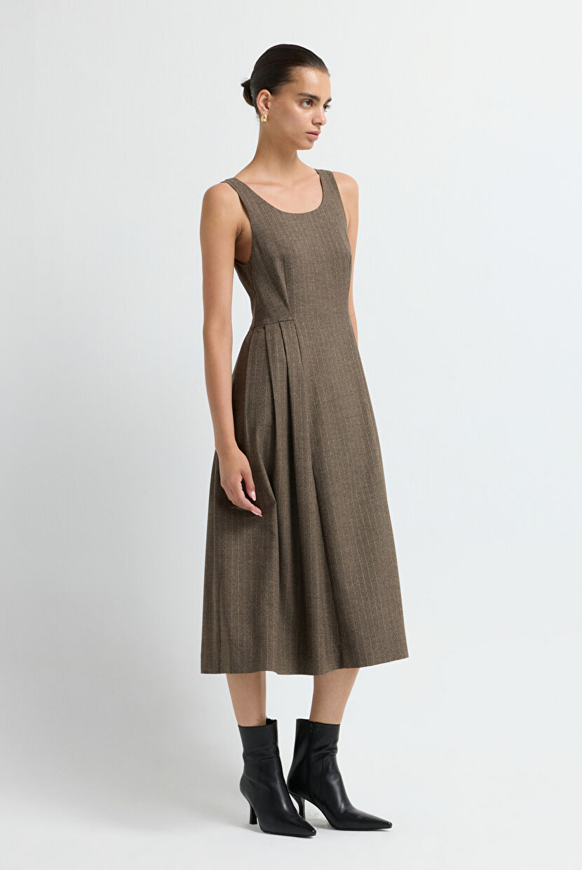 Kahverengi Kolsuz Asimetrik Desenli Elbise