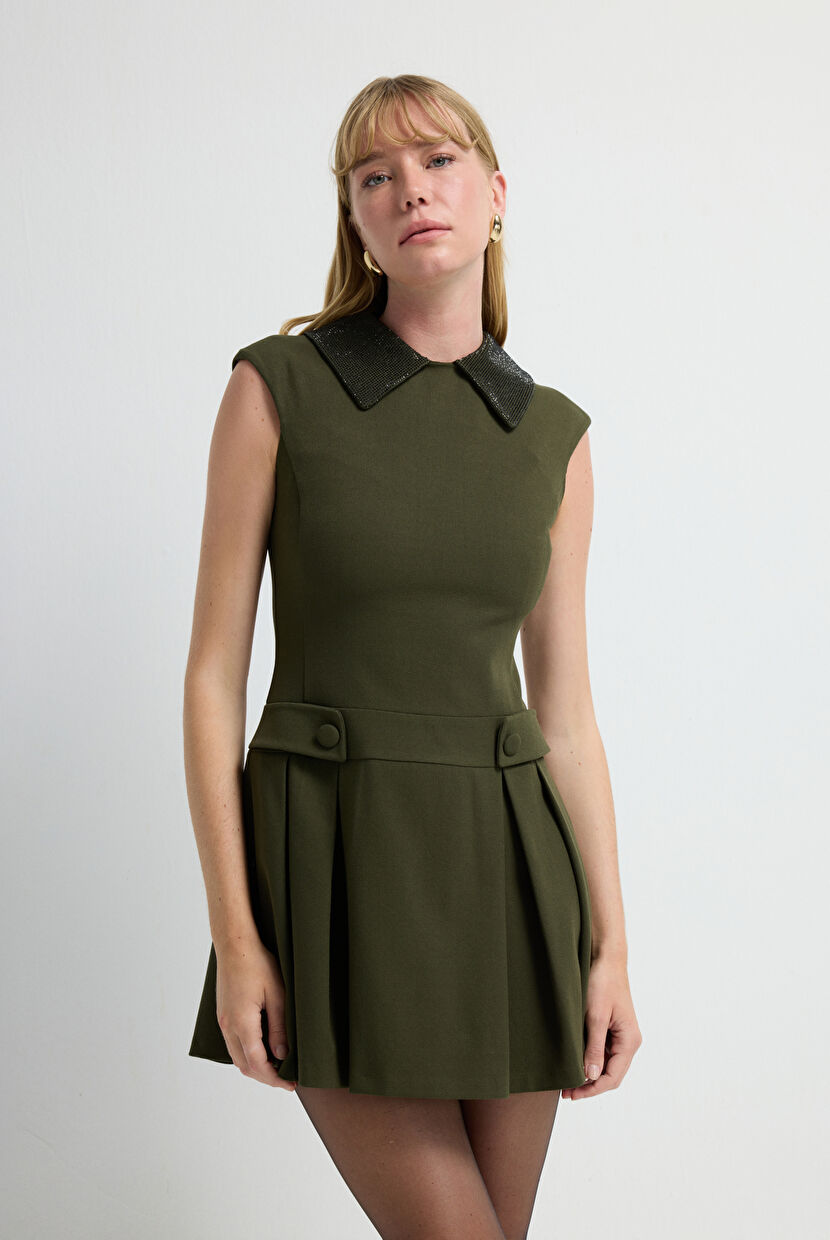 Haki Yakası Taş Detaylı Gabardin Elbise