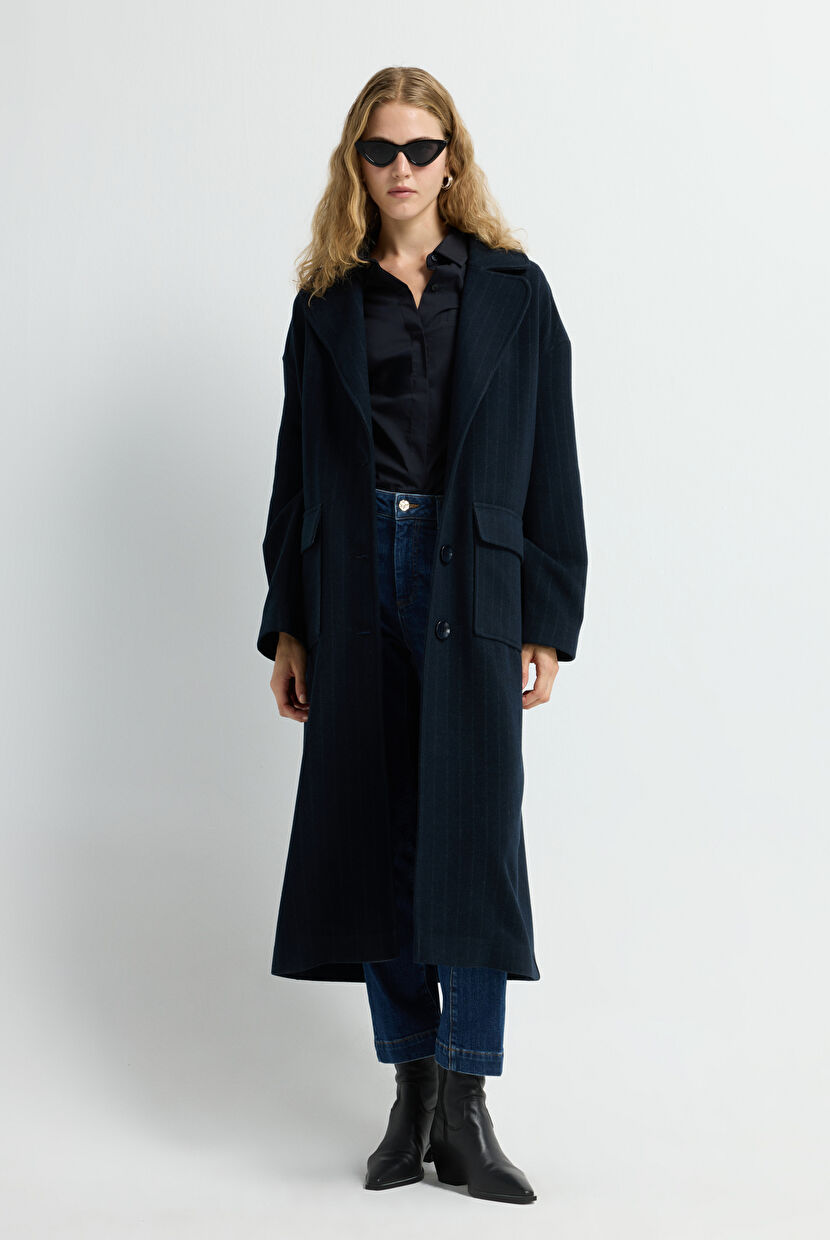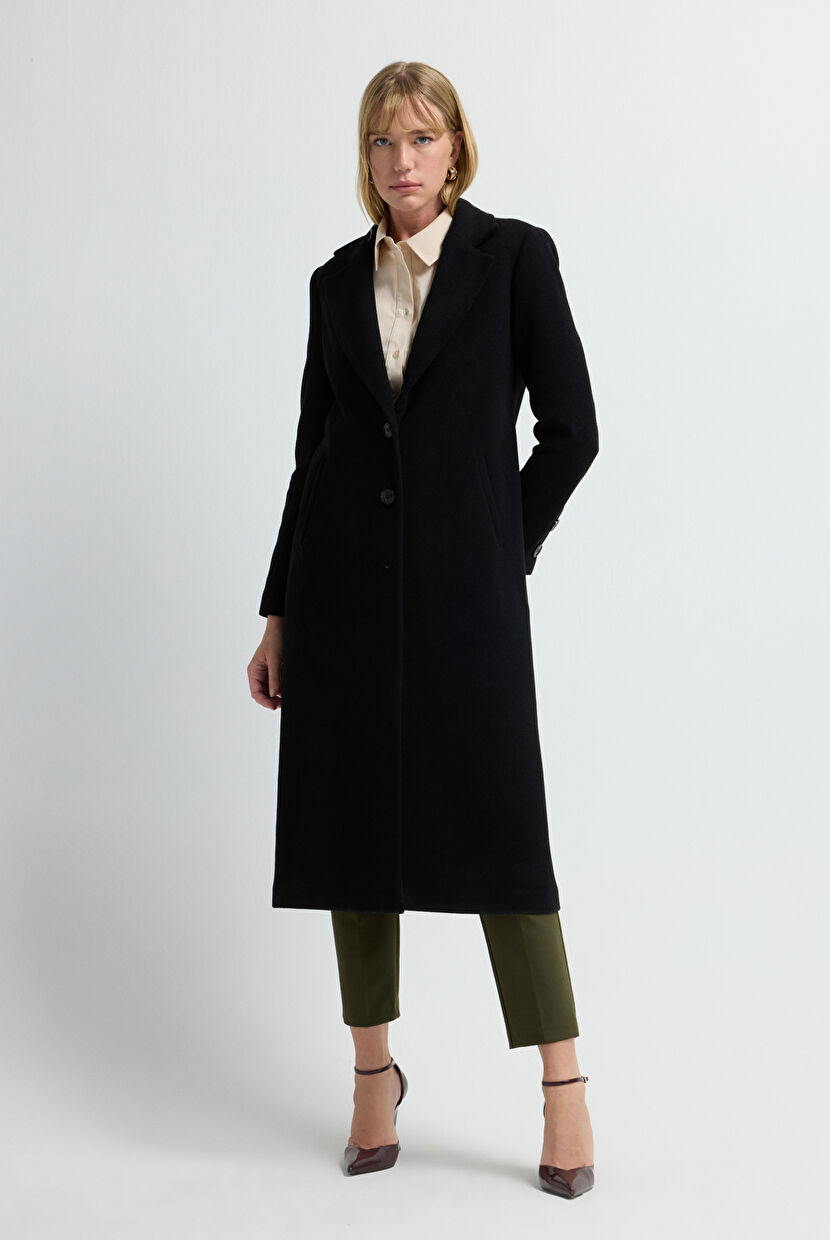 Siyah Kapüşonlu Garnili Yün Karışımlı Kaban