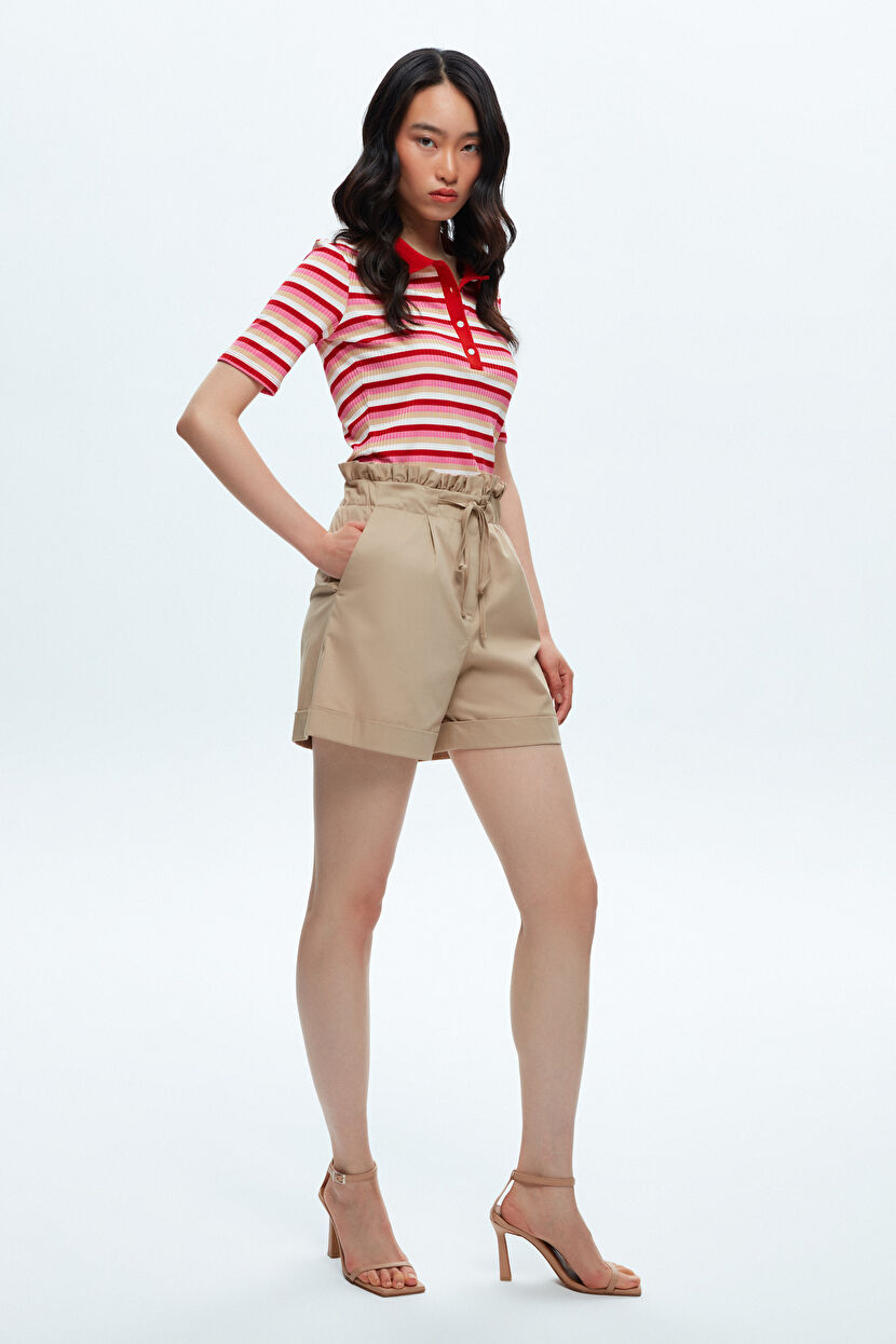 Bej Beli Fırfırlı Önden Bağcıklı Şort