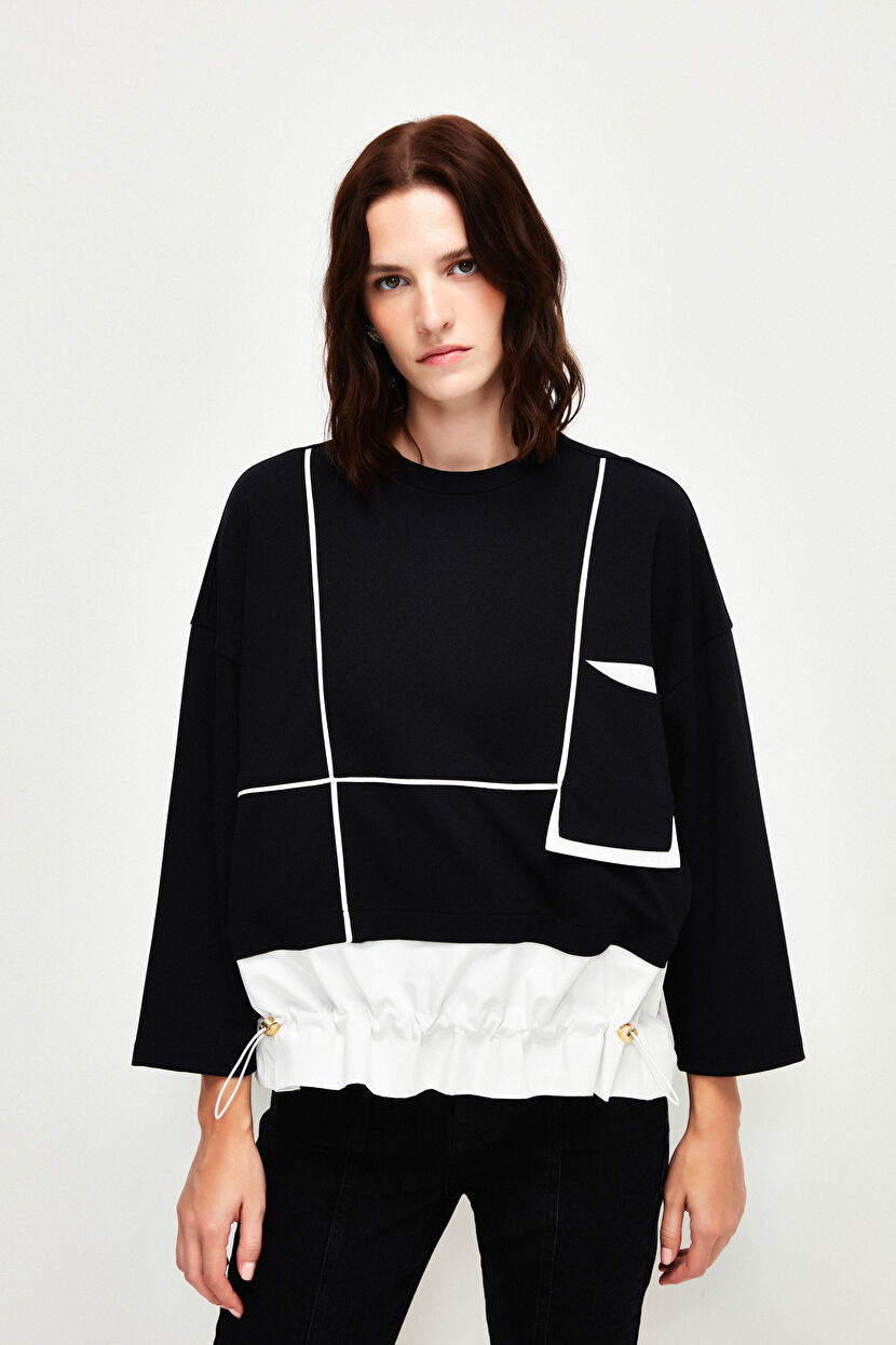Siyah Bağlamalı Kontast Garnili Sweatshirt